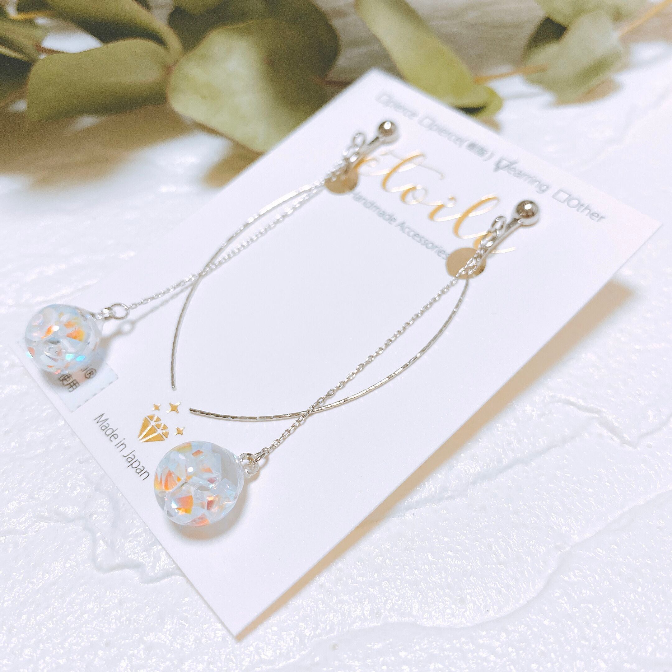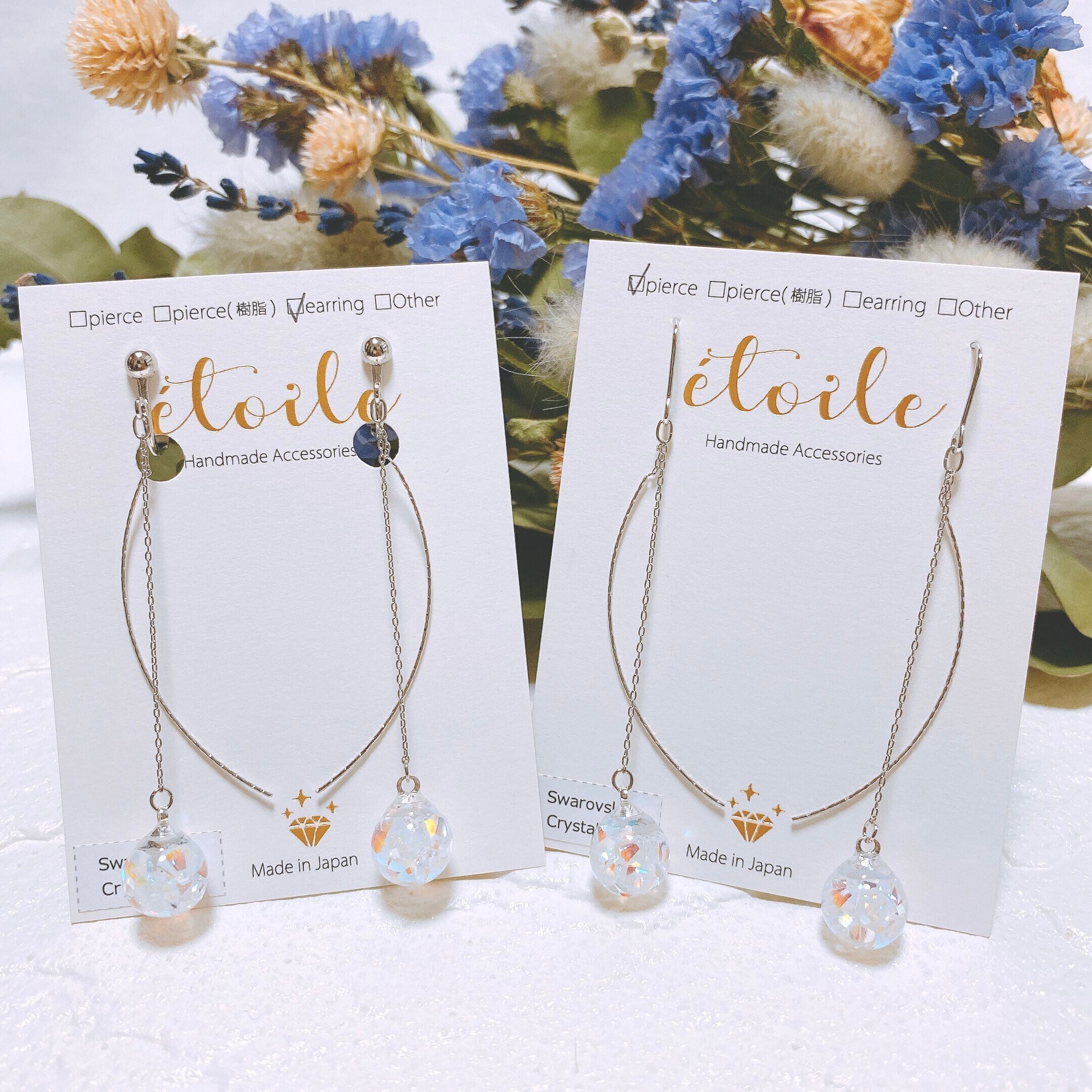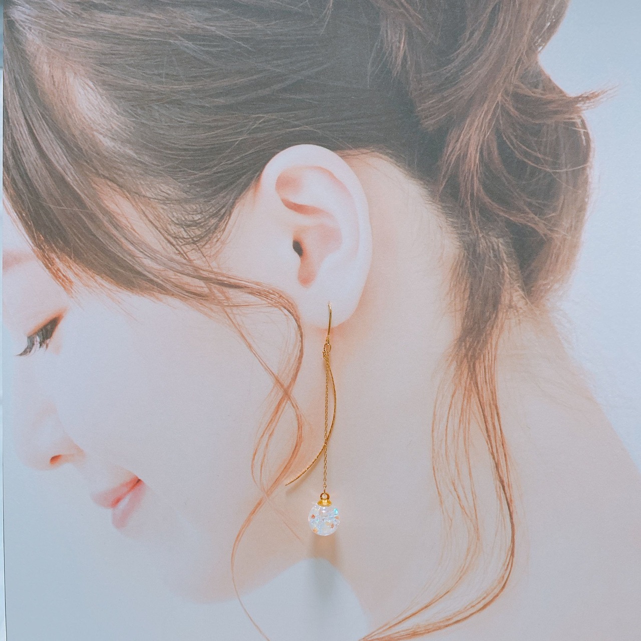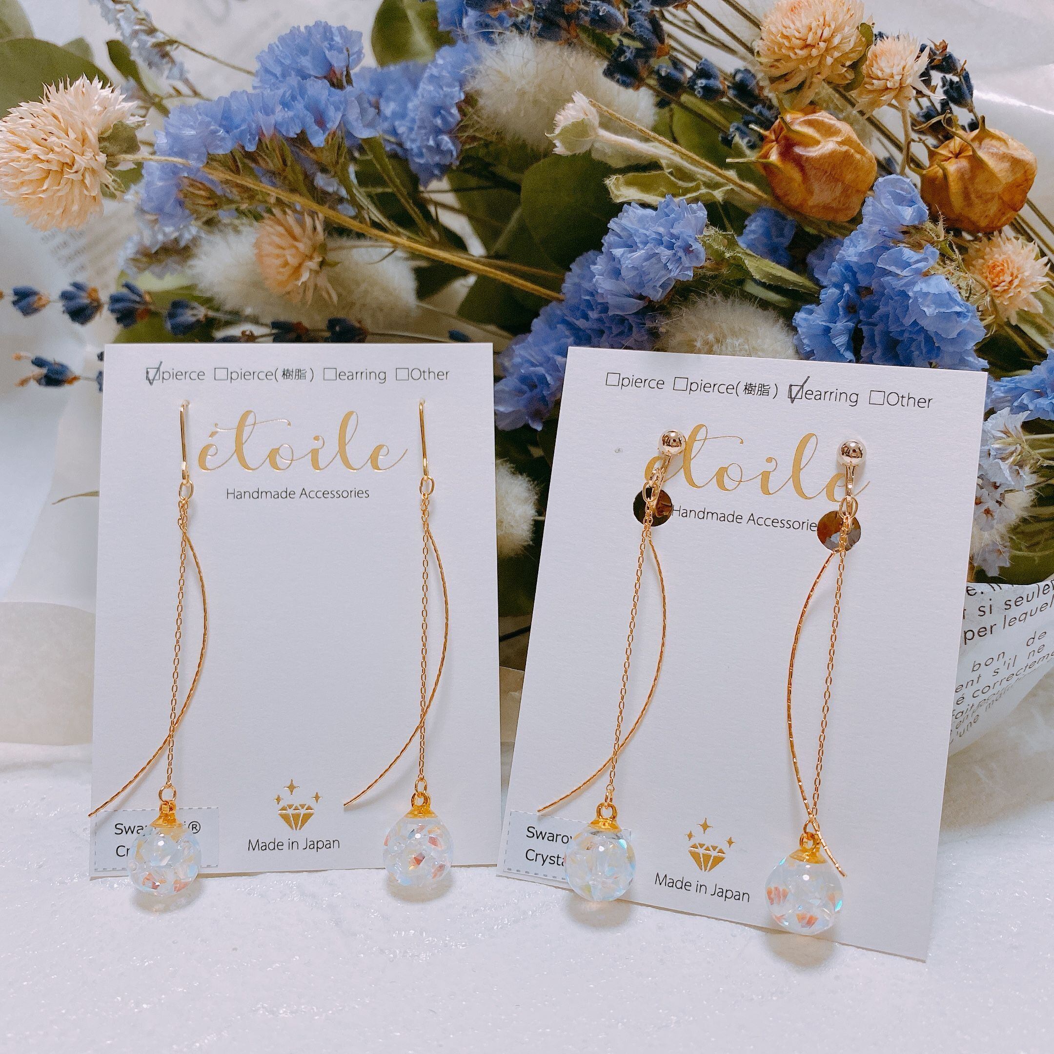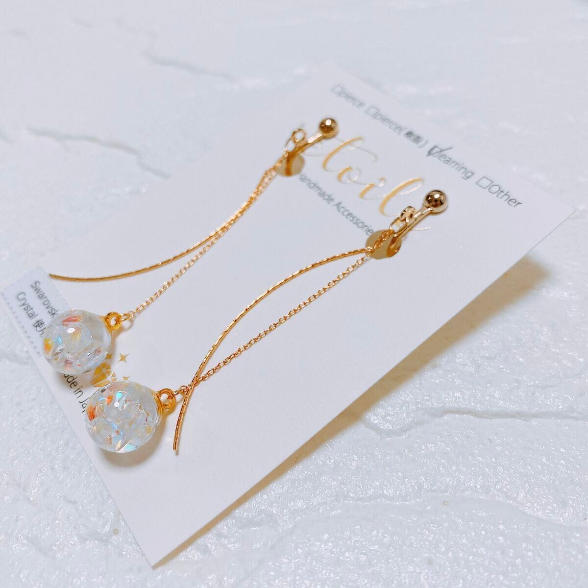 繊細なチェーンに輝く高級クリスタルガラスを使用した樹脂ドームをあしらった、ハンドメイドのピアス/イヤリングです。