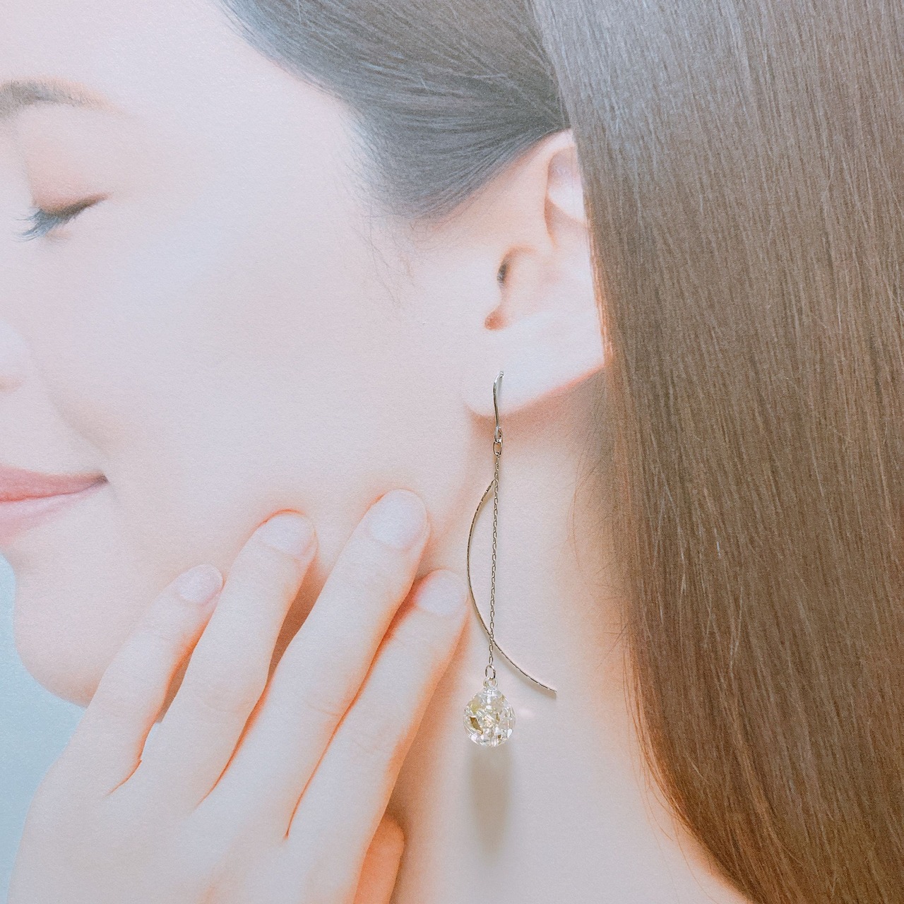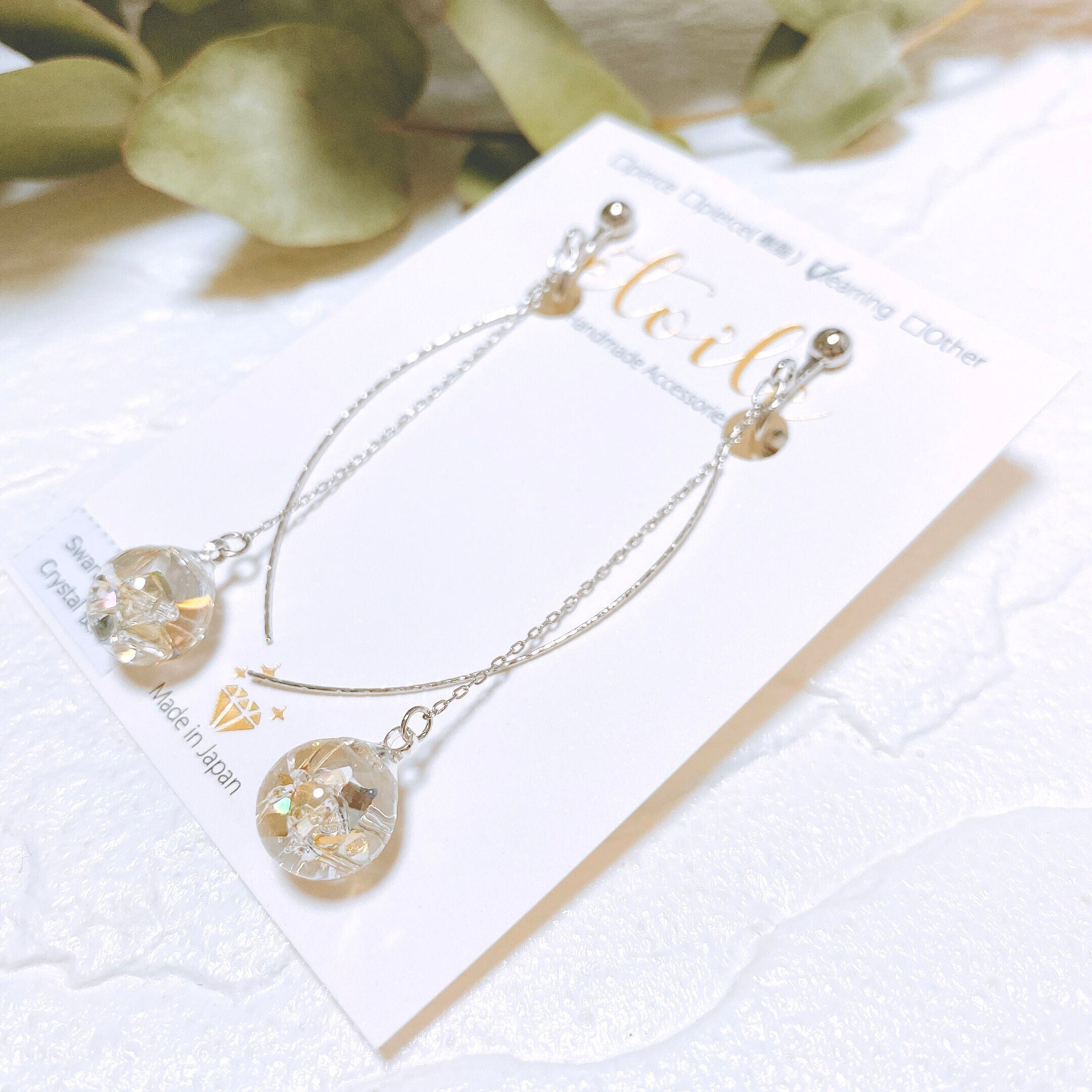繊細なチェーンに輝く高級クリスタルガラスを使用した樹脂ドームをあしらった、ハンドメイドのピアス/イヤリングです。