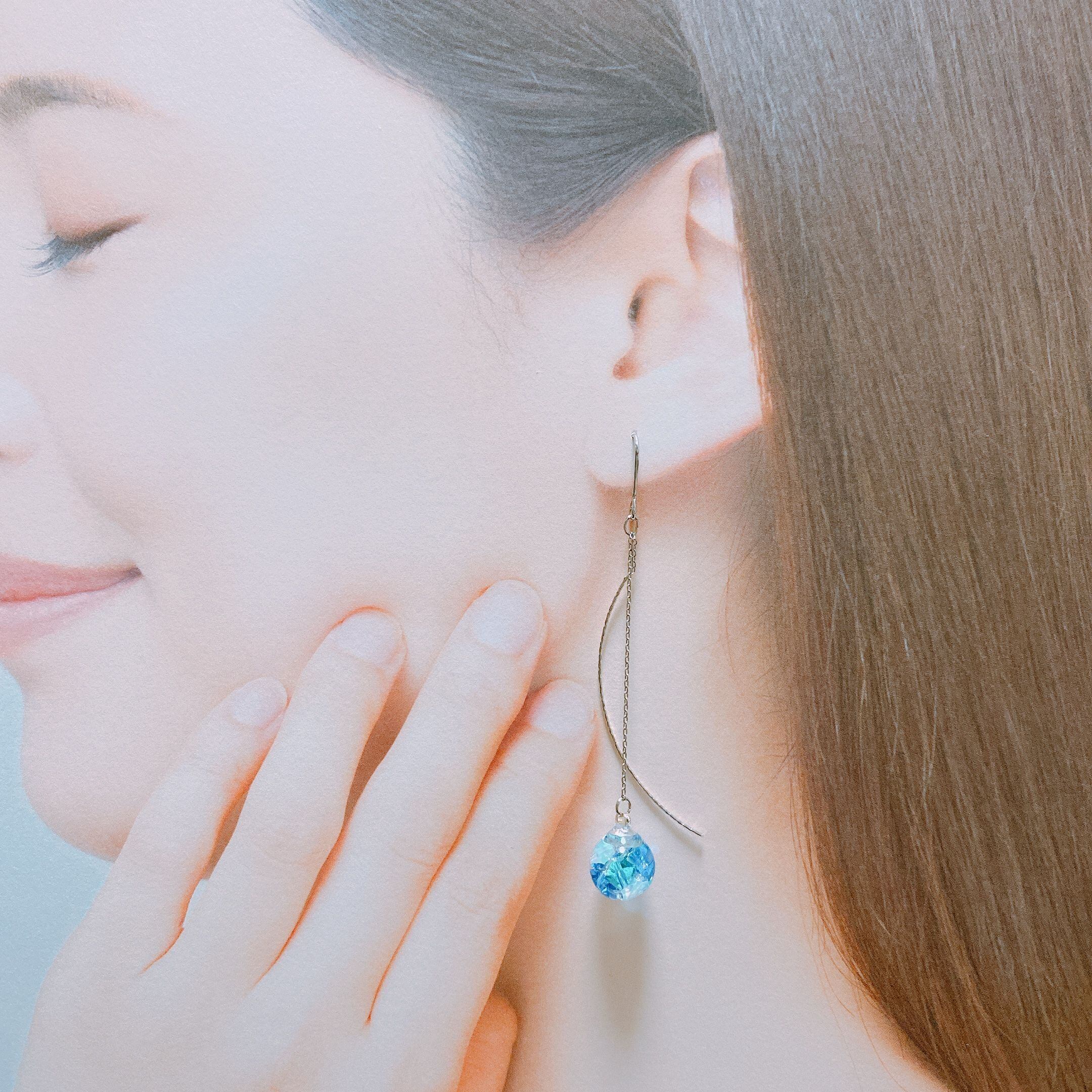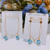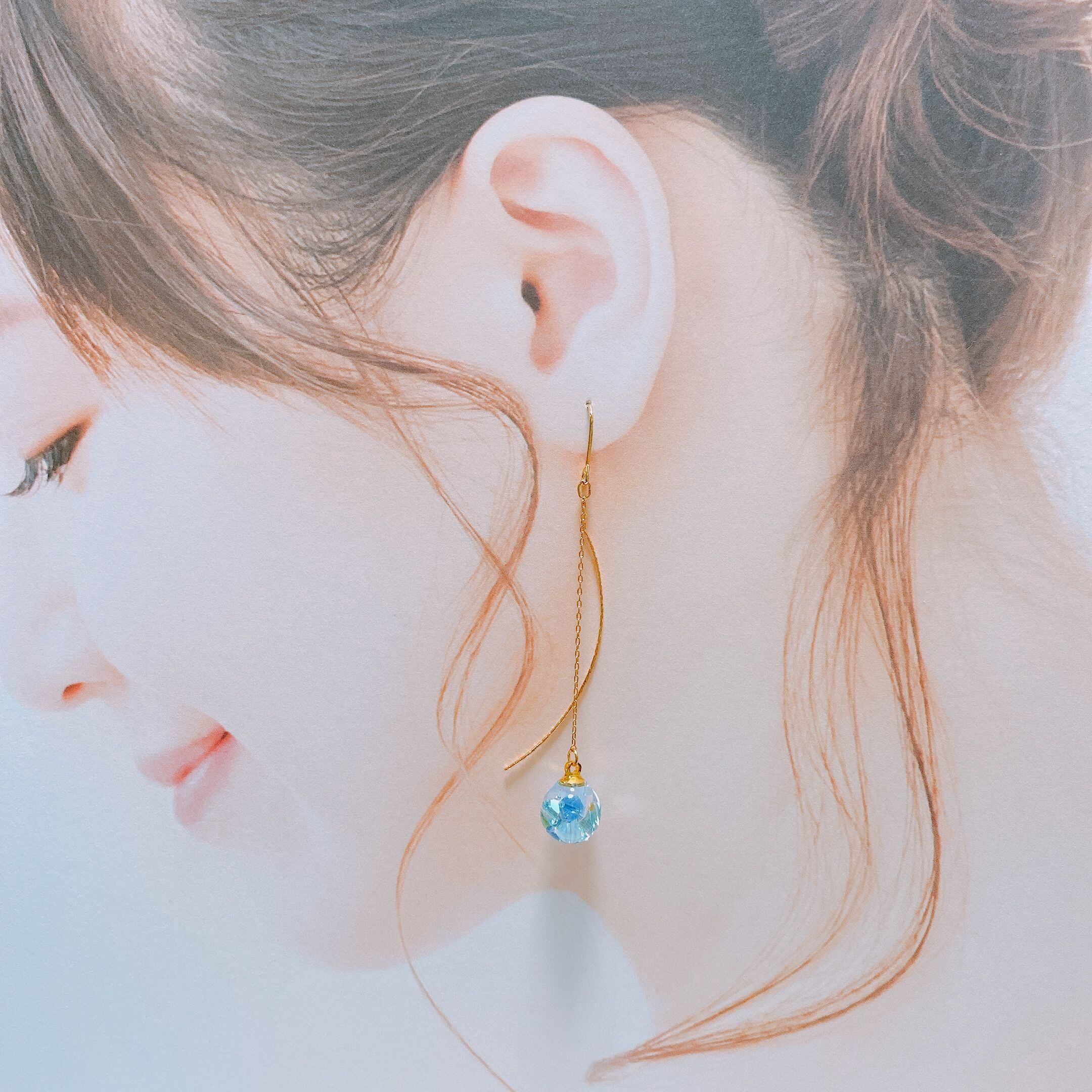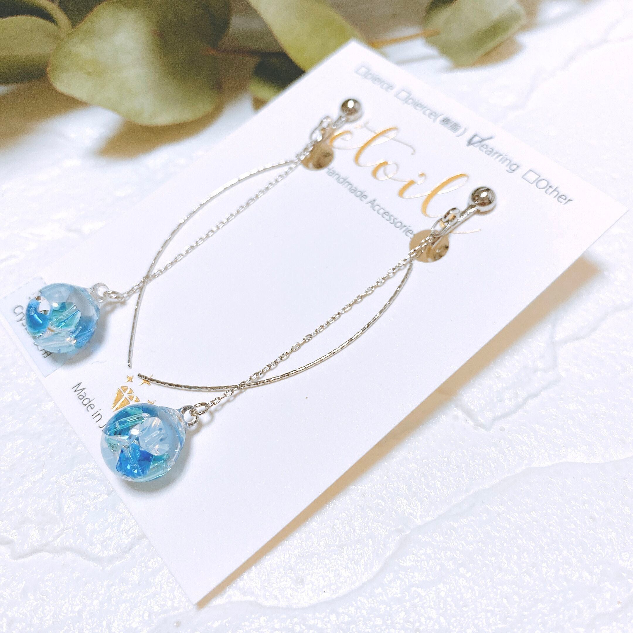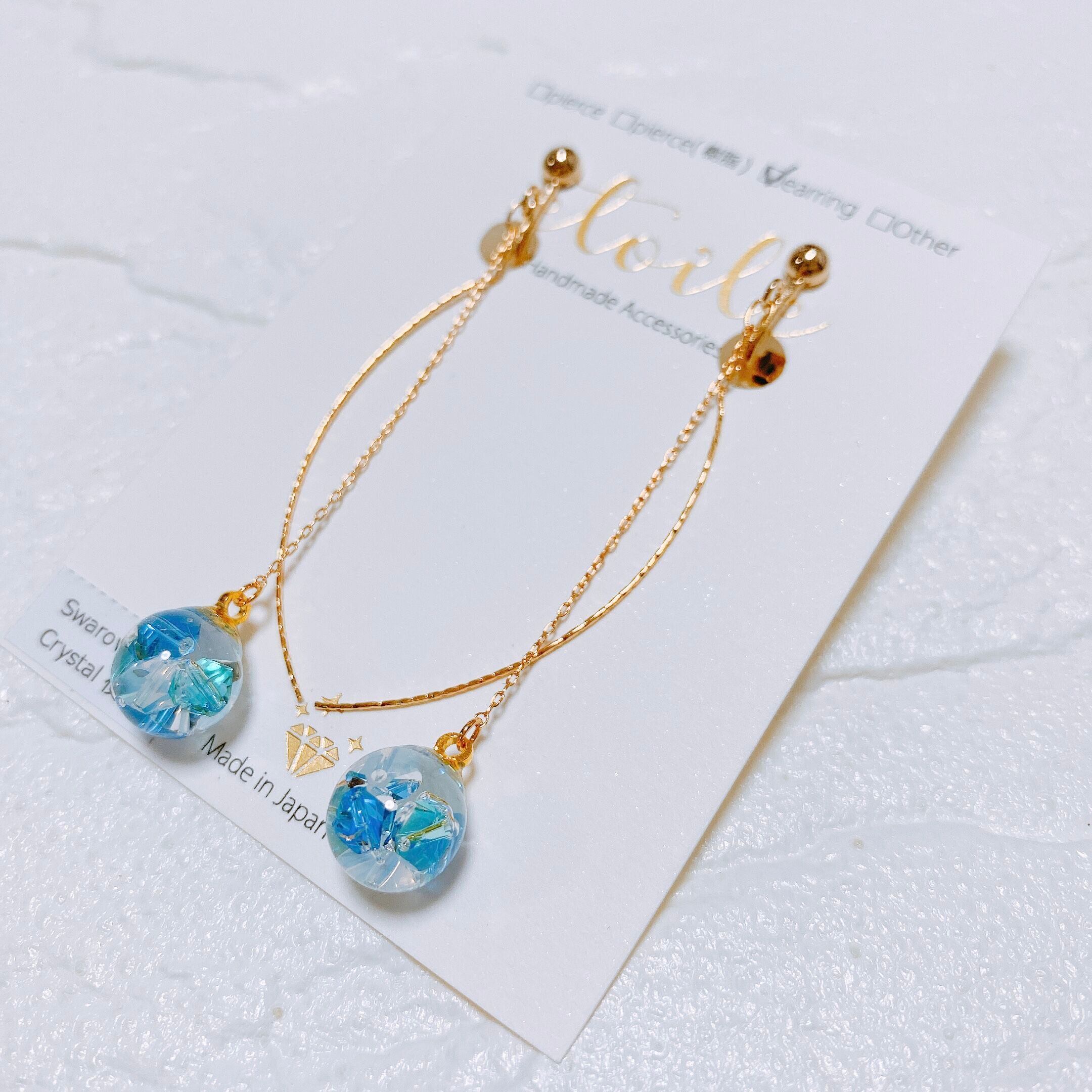繊細なチェーンに輝く高級クリスタルガラスを使用した樹脂ドームをあしらった、ハンドメイドのピアス/イヤリングです。