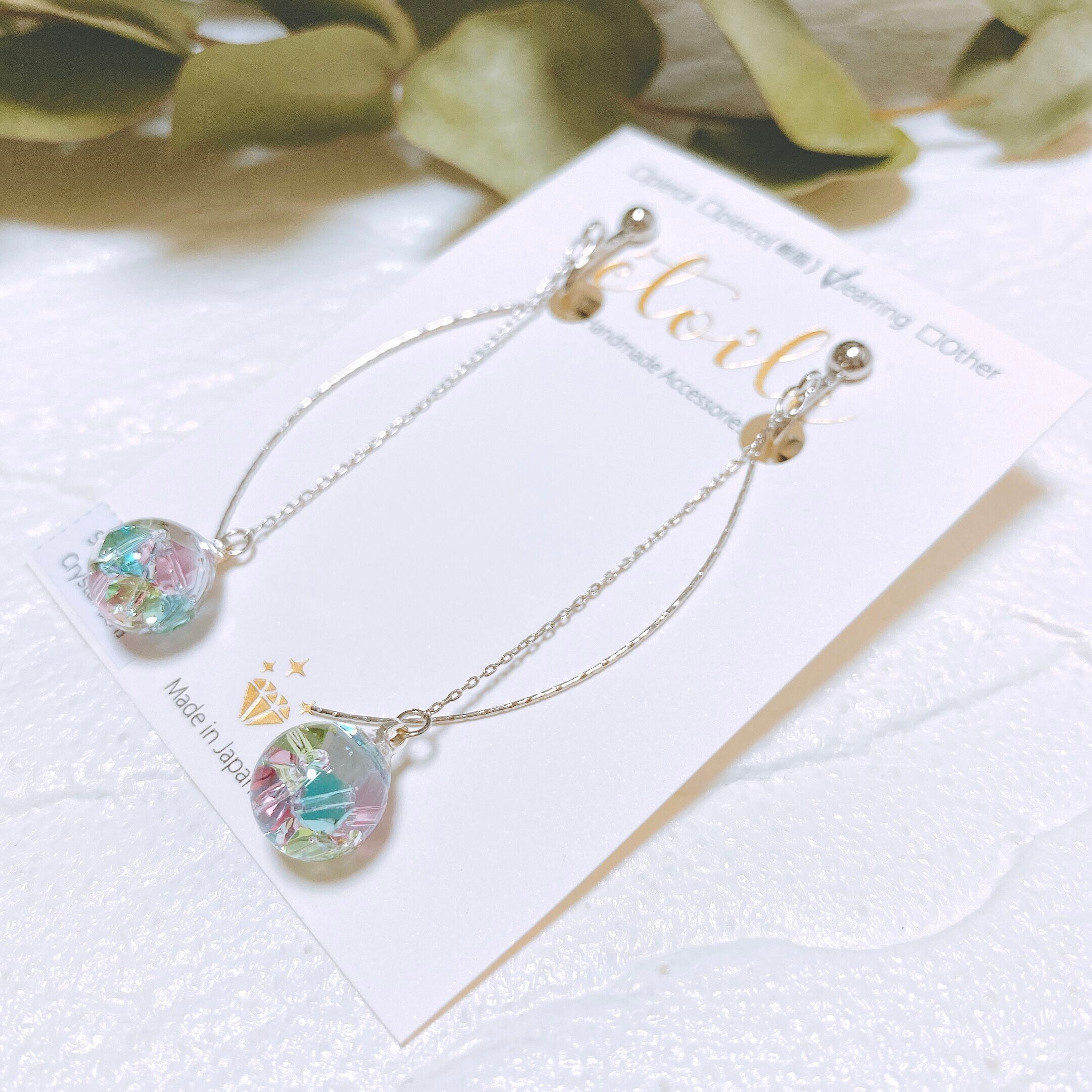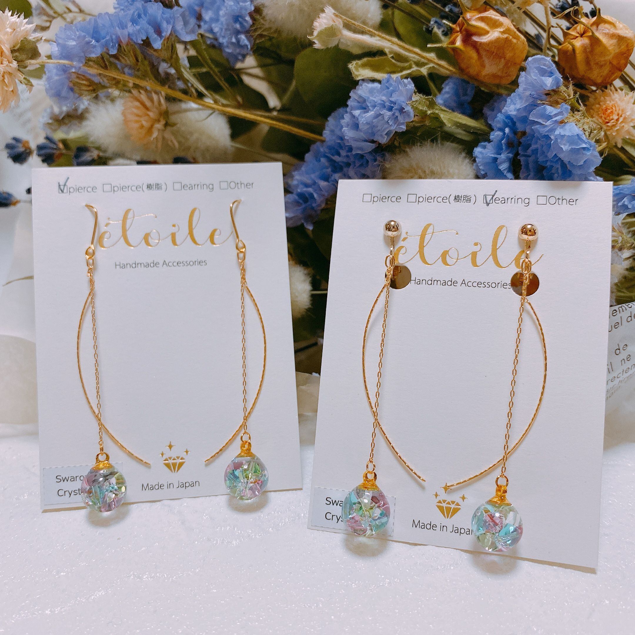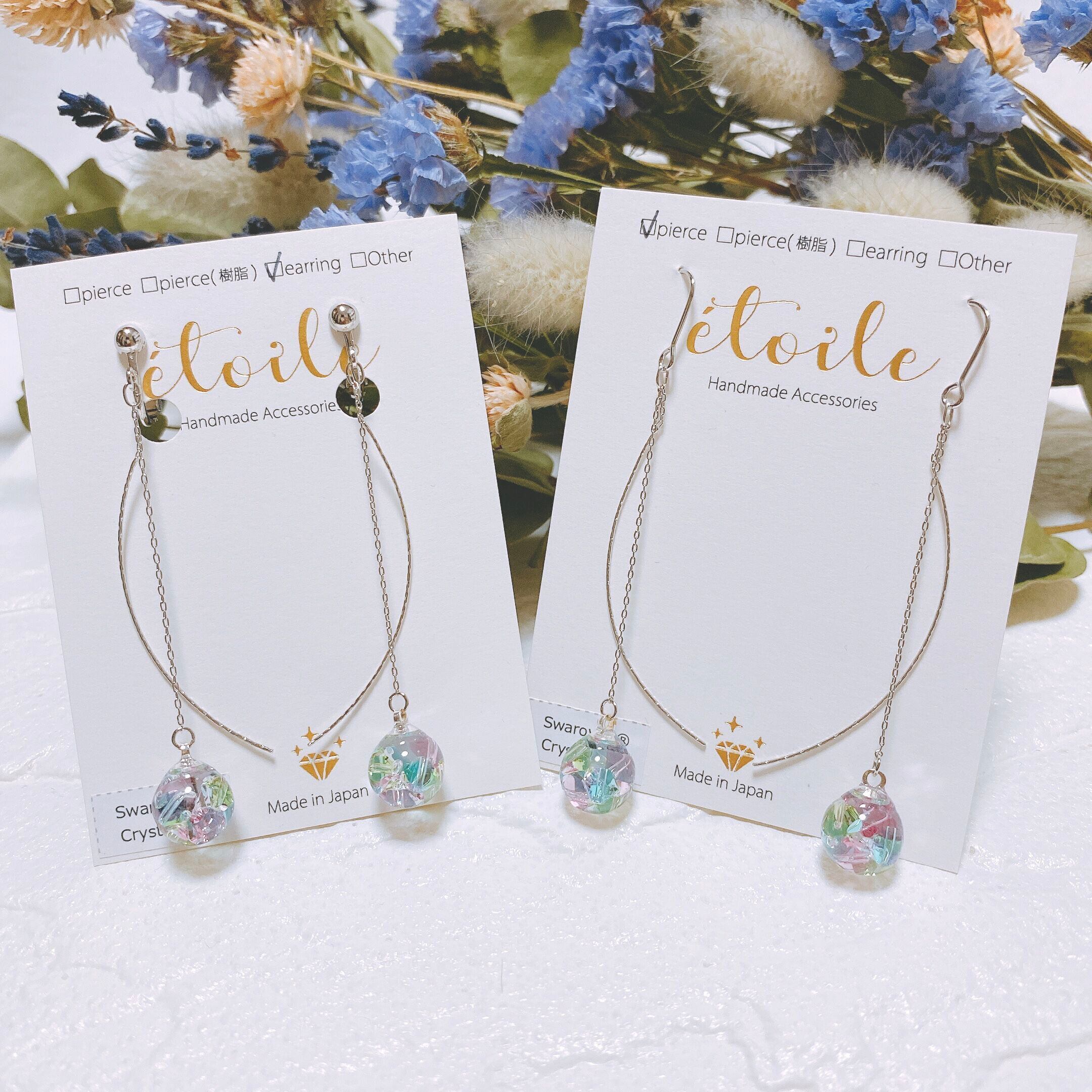 繊細なチェーンに輝く高級クリスタルガラスを使用した樹脂ドームをあしらった、ハンドメイドのピアス/イヤリングです。