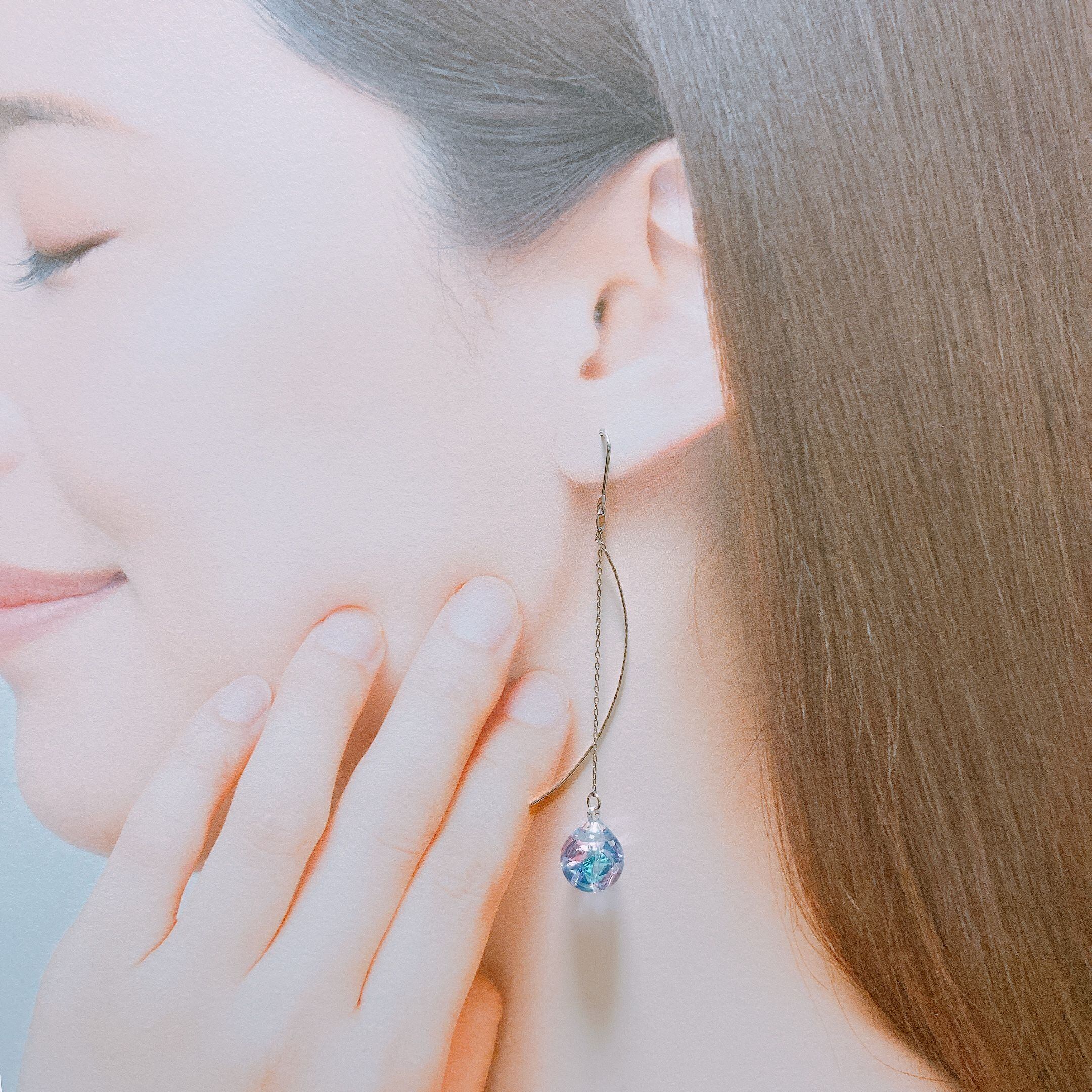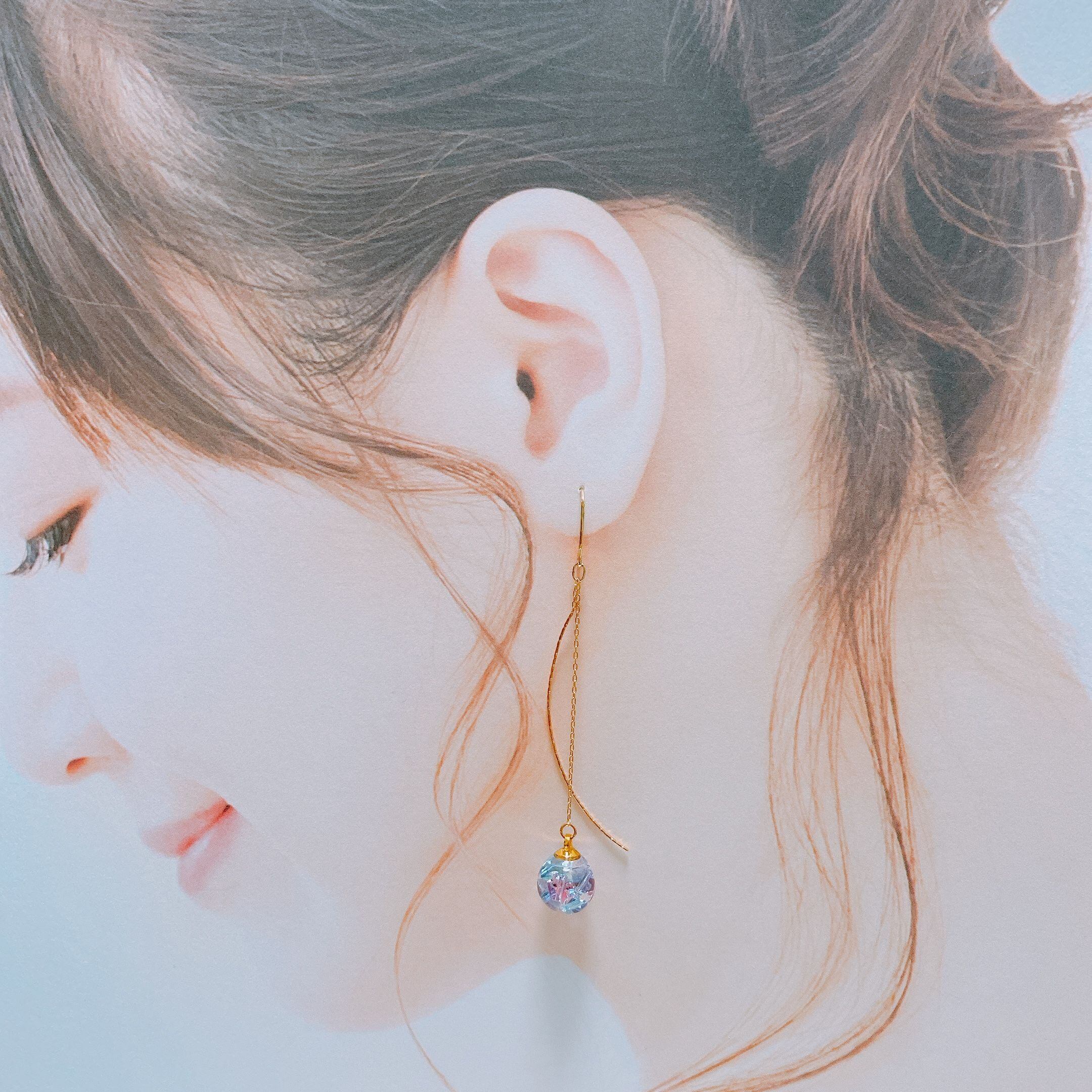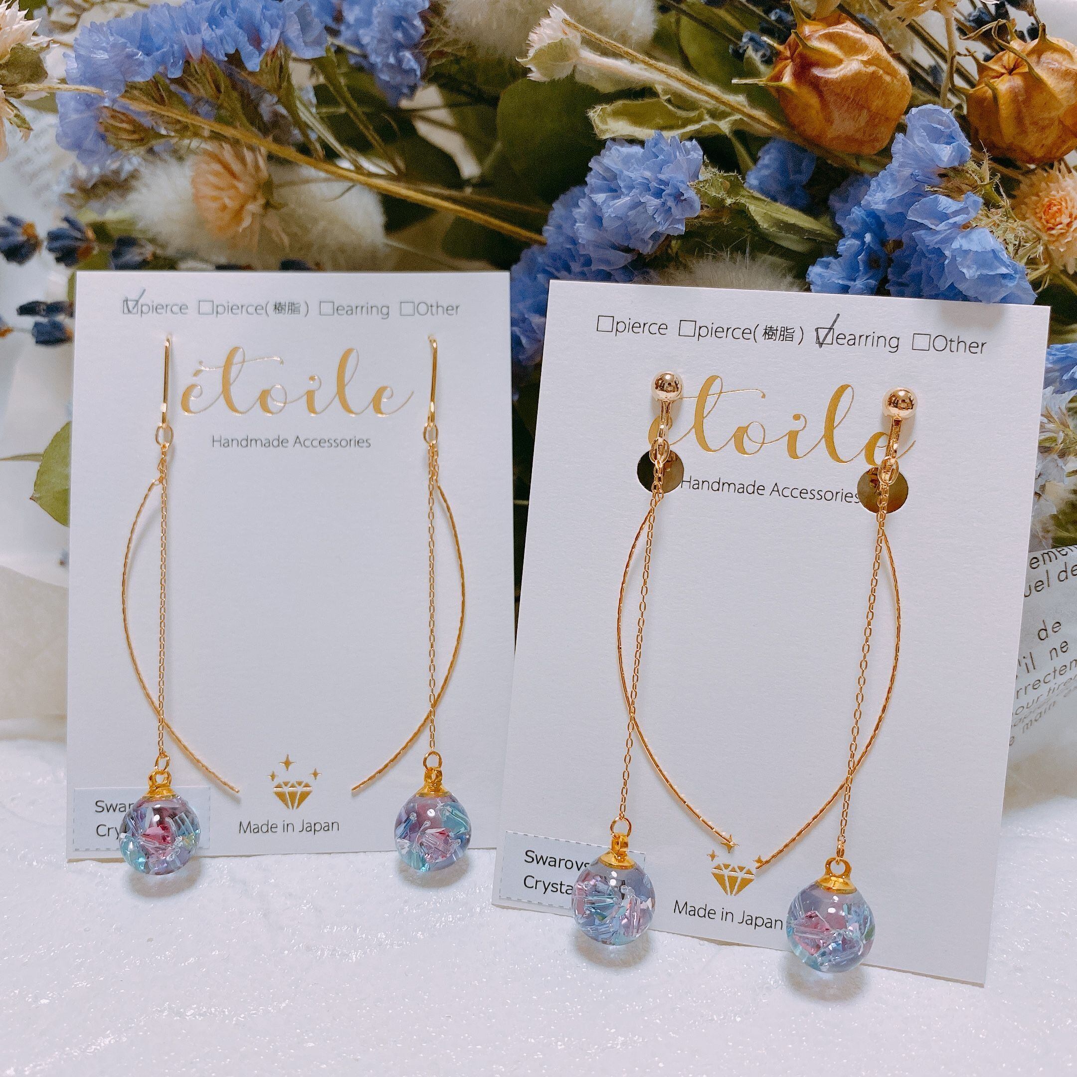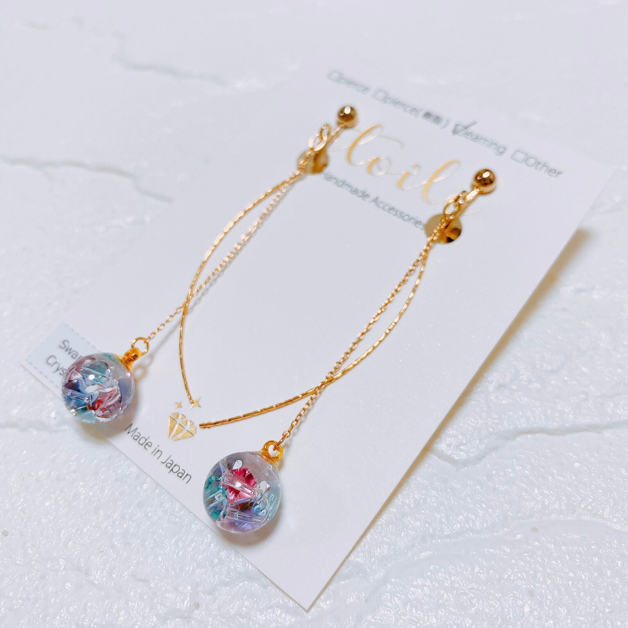 繊細なチェーンに輝く高級クリスタルガラスを使用した樹脂ドームをあしらった、ハンドメイドのピアス/イヤリングです。