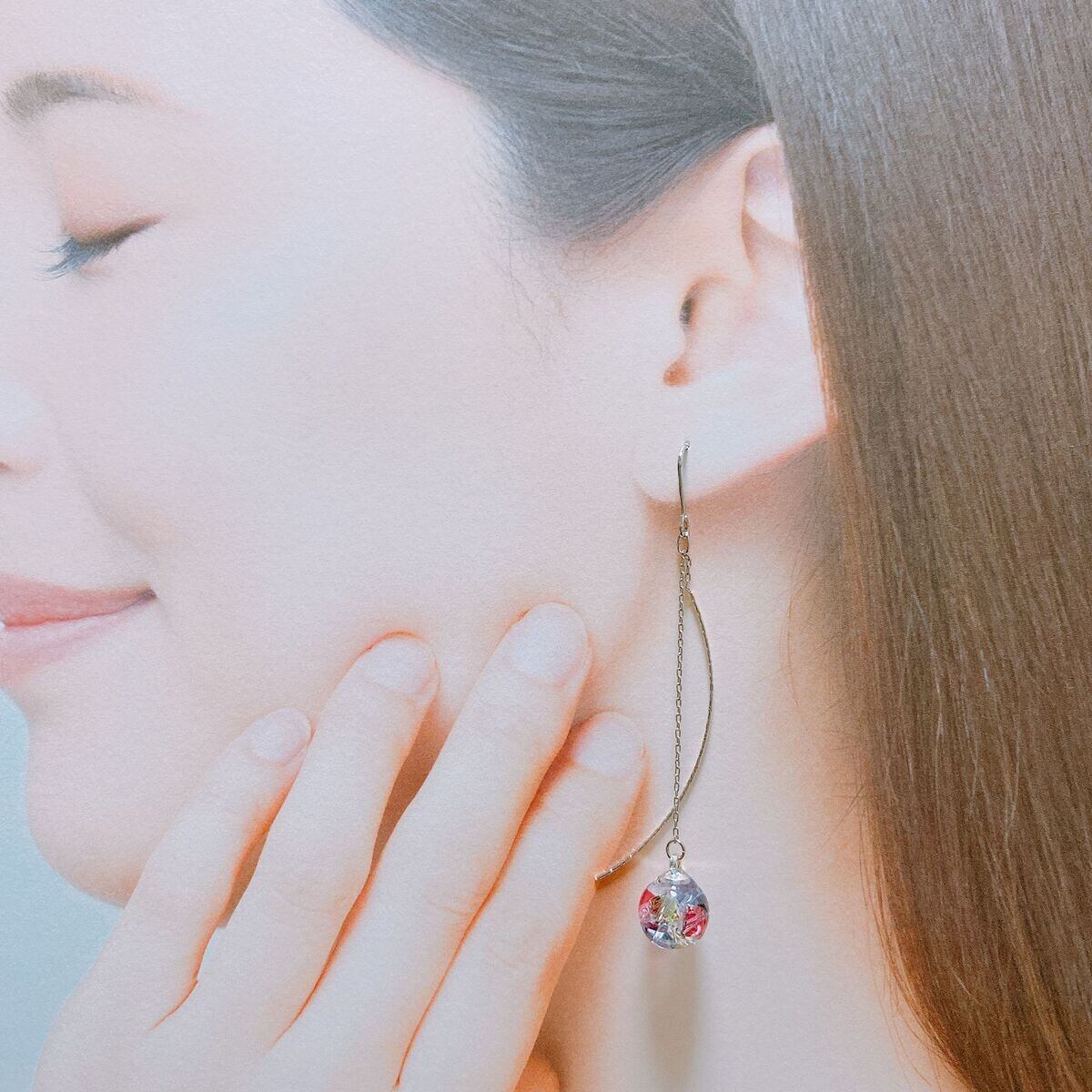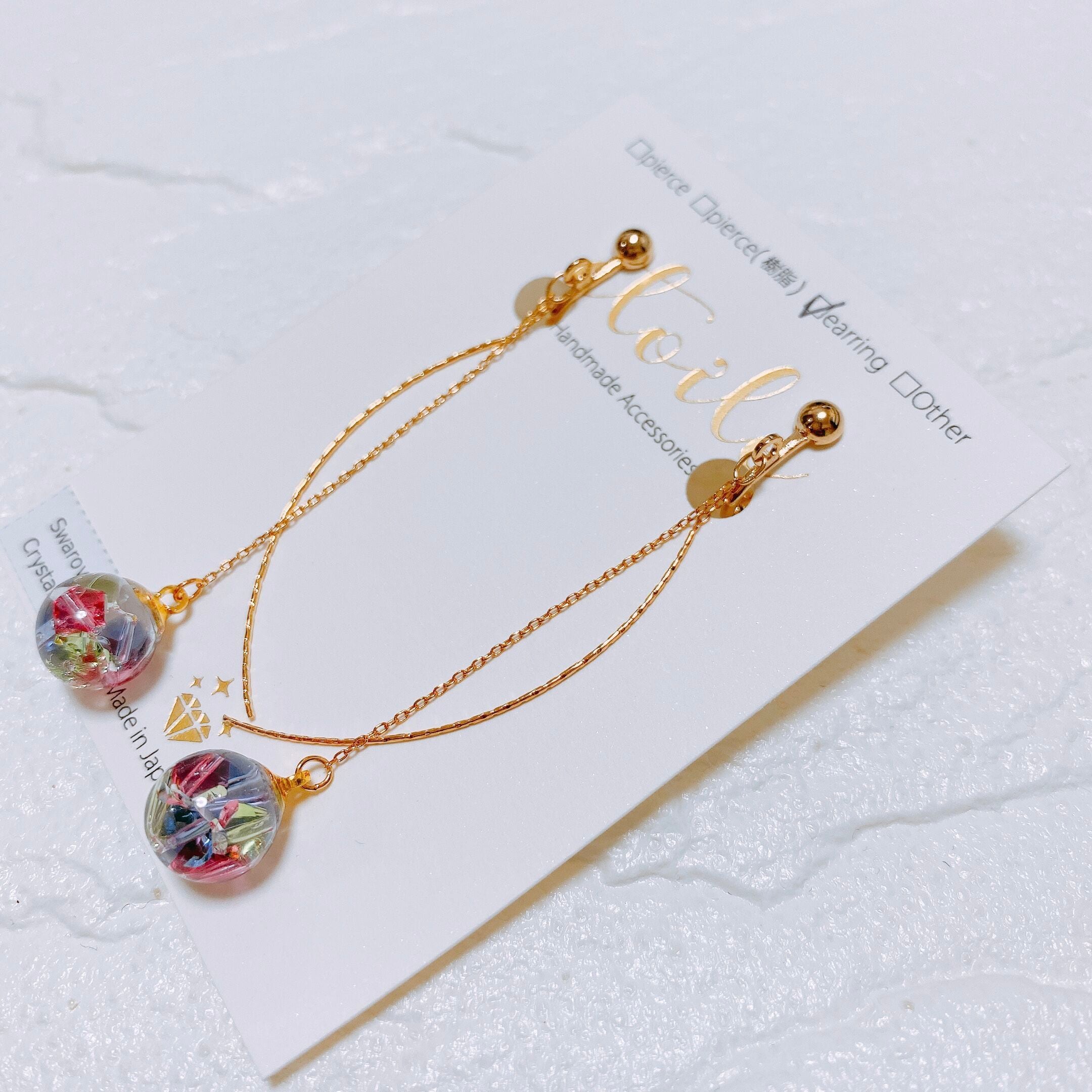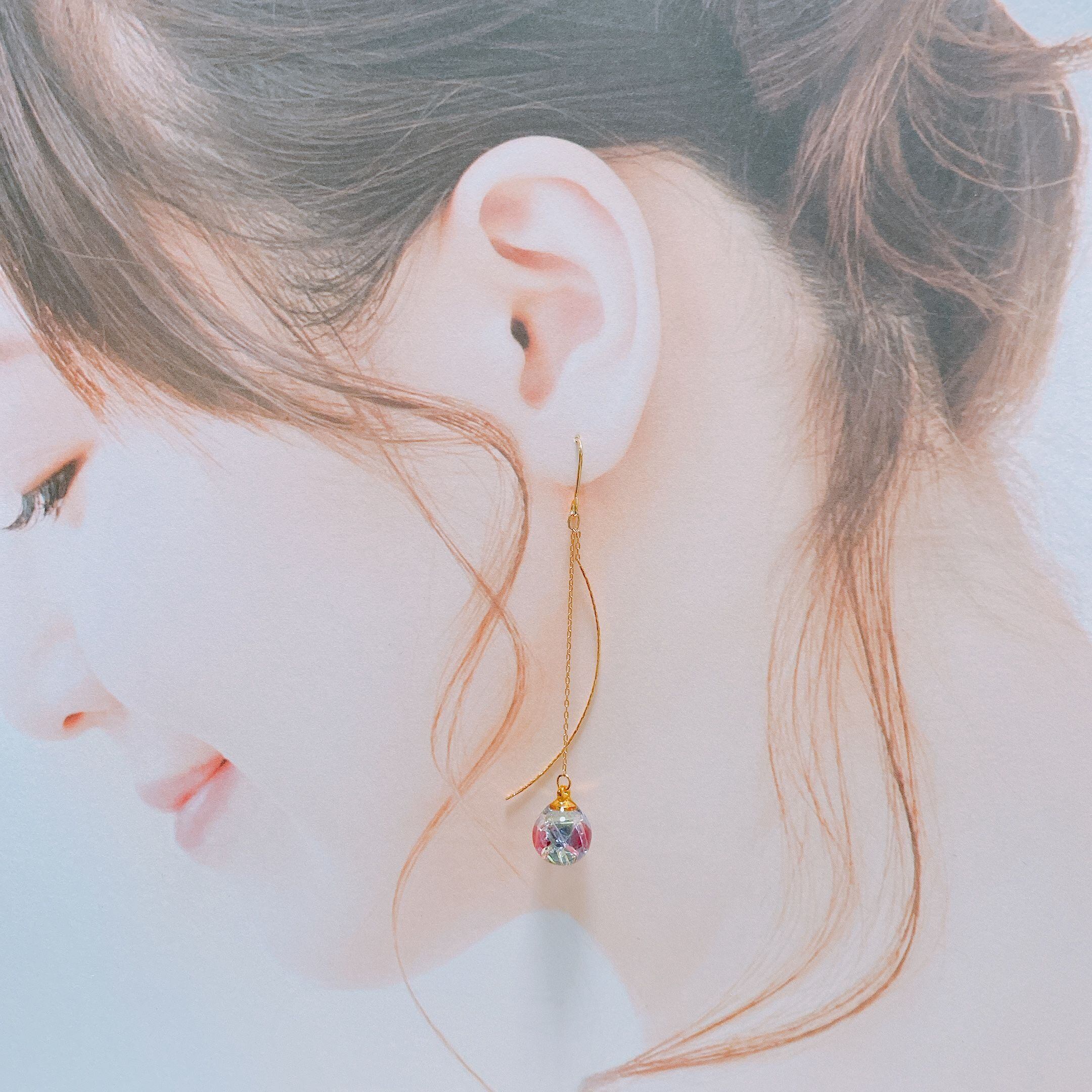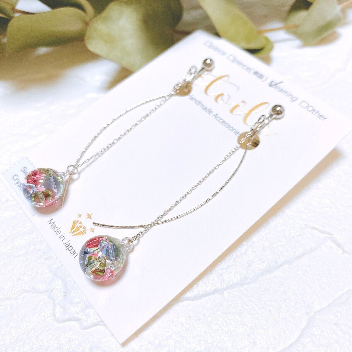 繊細なチェーンに輝く高級クリスタルガラスを使用した樹脂ドームをあしらった、ハンドメイドのピアス/イヤリングです。