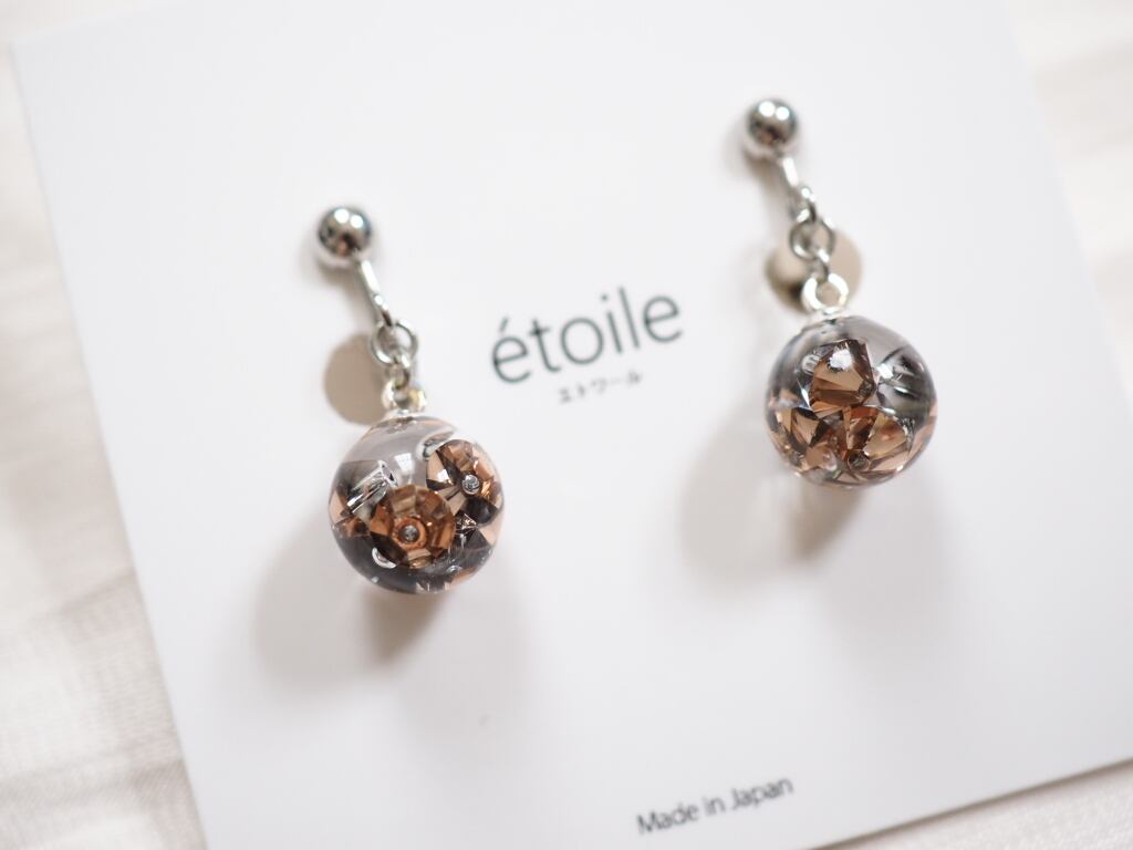 澄んだ樹脂ドームの中に高級クリスタルガラスを閉じ込めた、ラグジュアリーな輝きを放つピアス/イヤリング。