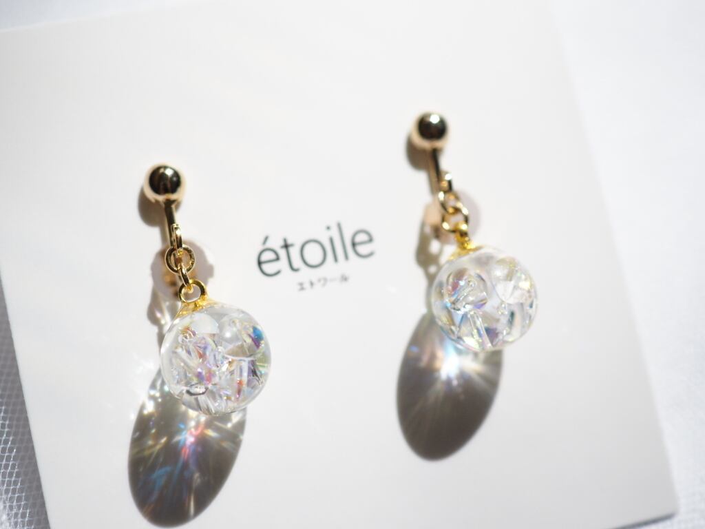澄んだ樹脂ドームの中に高級クリスタルガラスを閉じ込めた、ラグジュアリーな輝きを放つピアス/イヤリング。