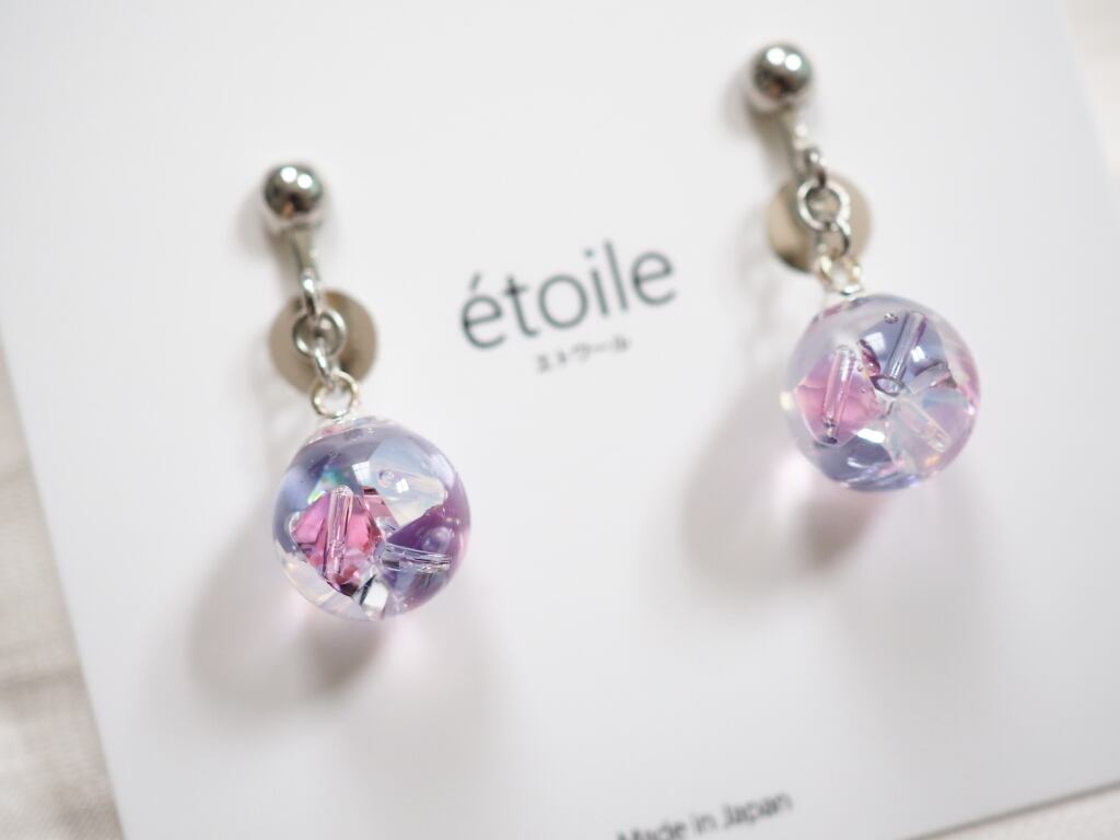 澄んだ樹脂ドームの中に高級クリスタルガラスを閉じ込めた、ラグジュアリーな輝きを放つピアス/イヤリング。
