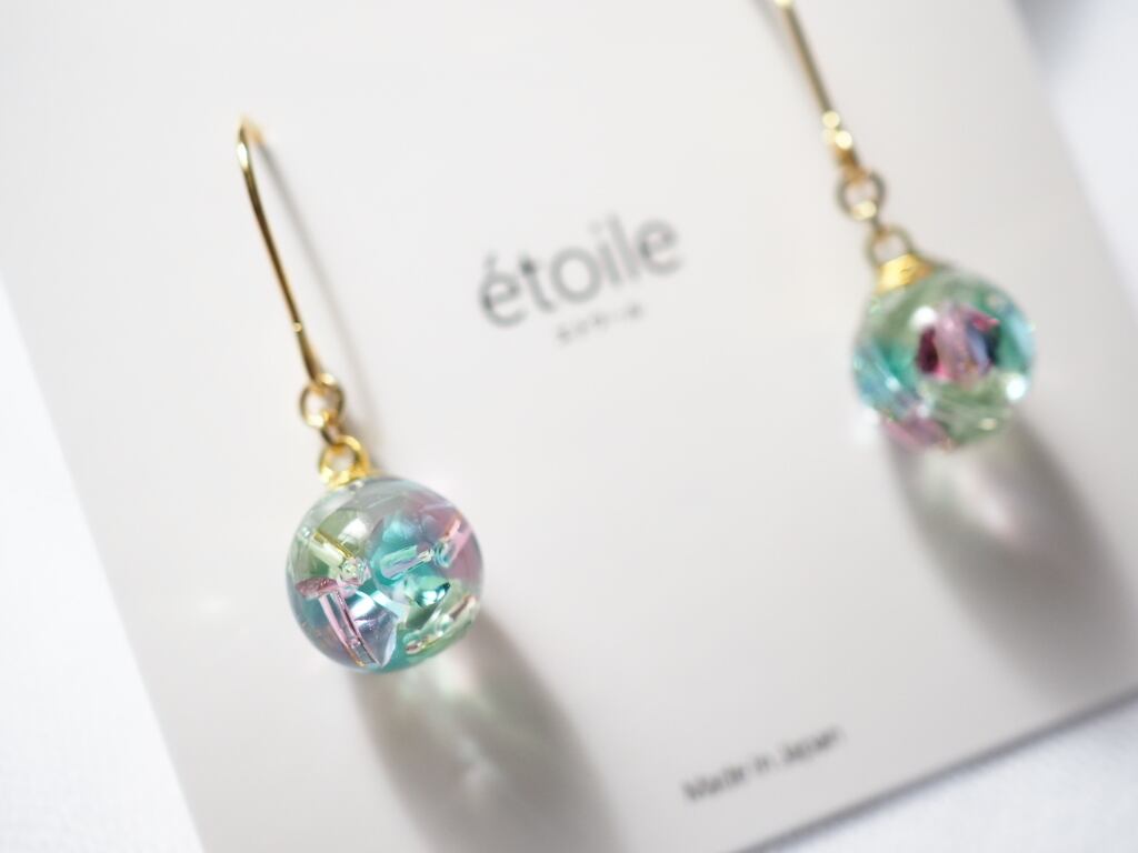 澄んだ樹脂ドームの中に高級クリスタルガラスを閉じ込めた、ラグジュアリーな輝きを放つピアス/イヤリング。