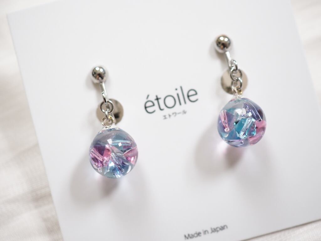 澄んだ樹脂ドームの中に高級クリスタルガラスを閉じ込めた、ラグジュアリーな輝きを放つピアス/イヤリング。