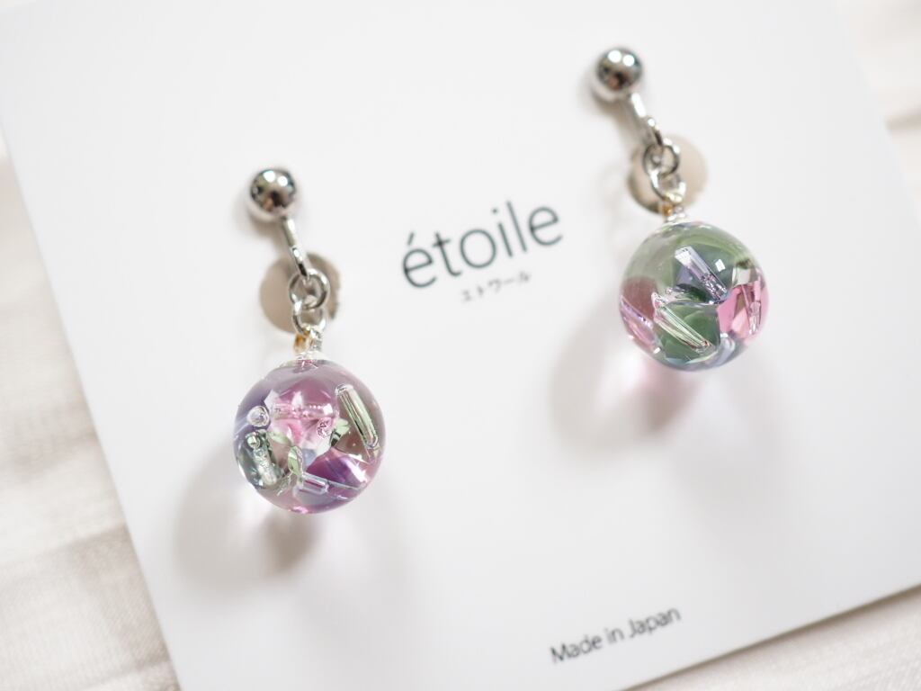 澄んだ樹脂ドームの中に高級クリスタルガラスを閉じ込めた、ラグジュアリーな輝きを放つピアス/イヤリング。