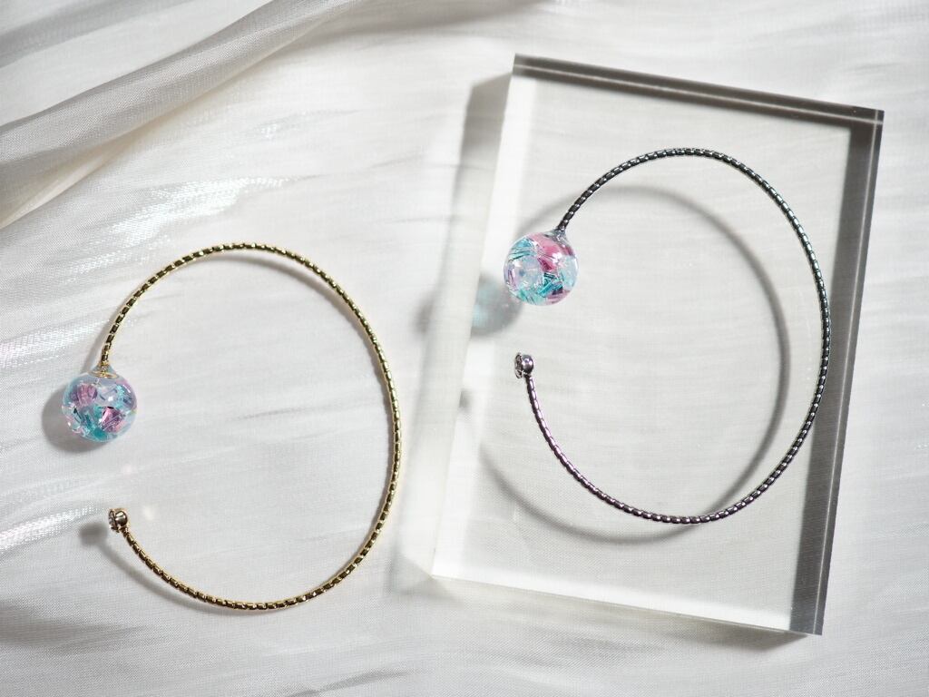 澄み渡る樹脂ドームに高級クリスタルガラスを閉じ込めた、上質なハンドメイドバングル。