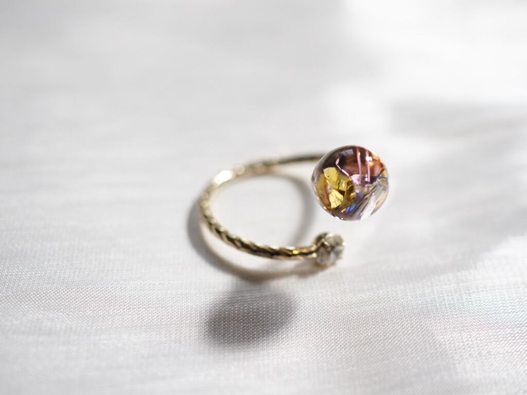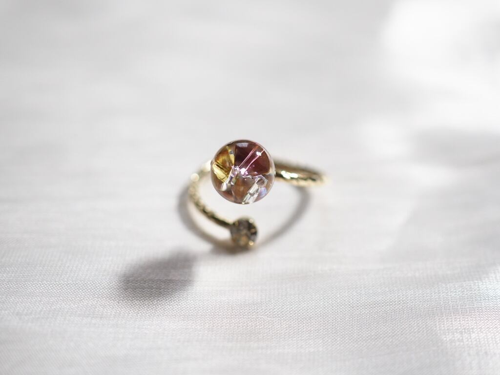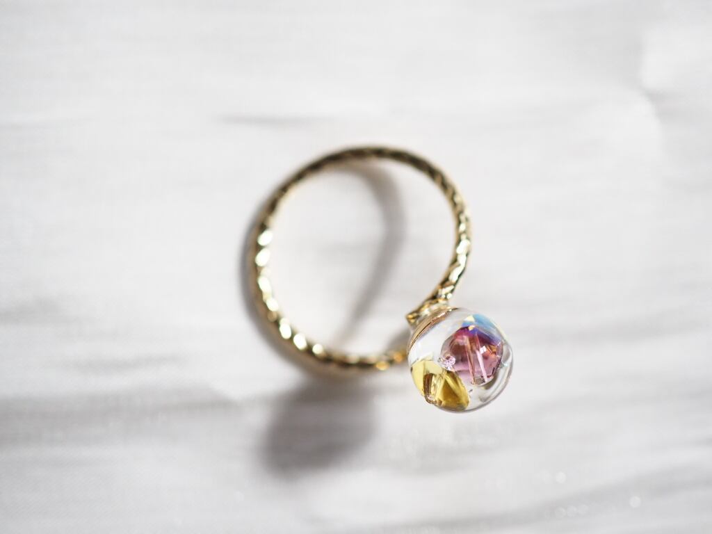 澄んだ樹脂ドームの中に高級クリスタルガラスを閉じ込めた、気品漂うハンドメイドリング。