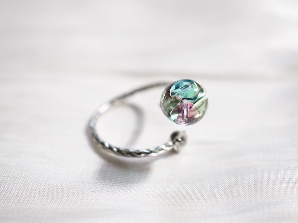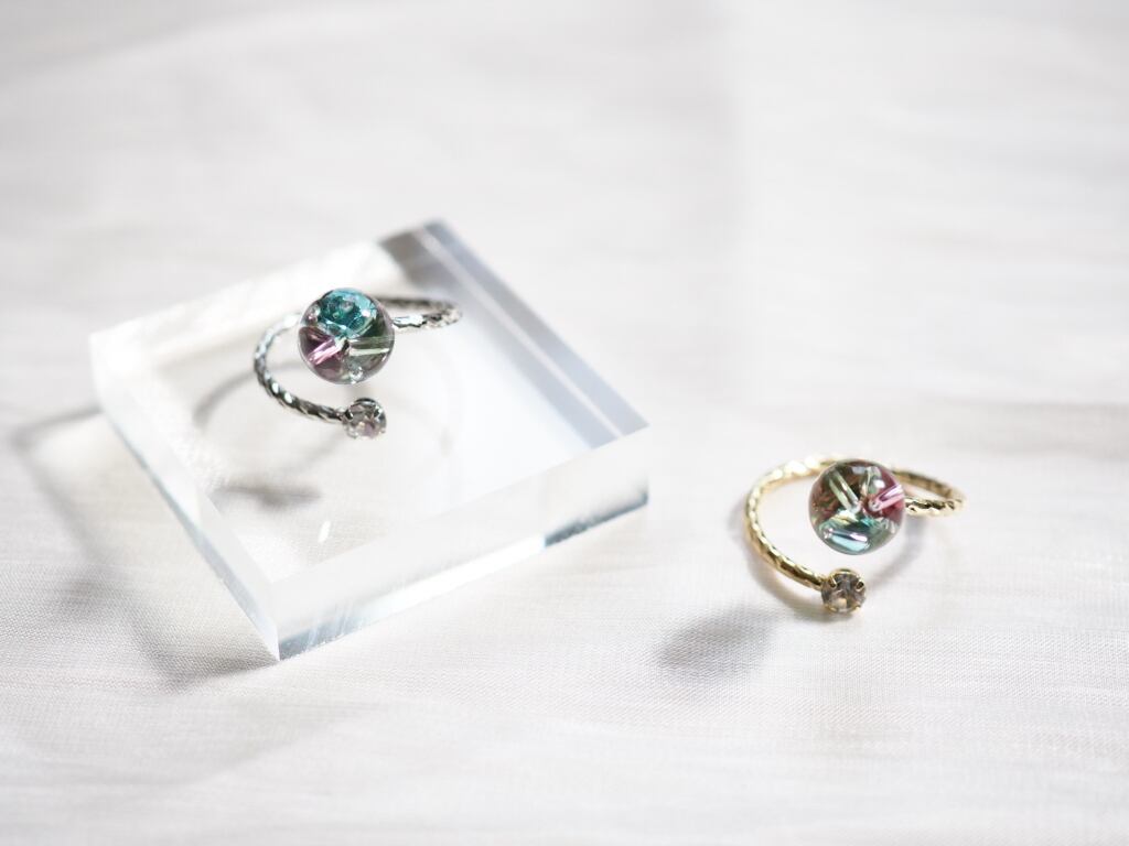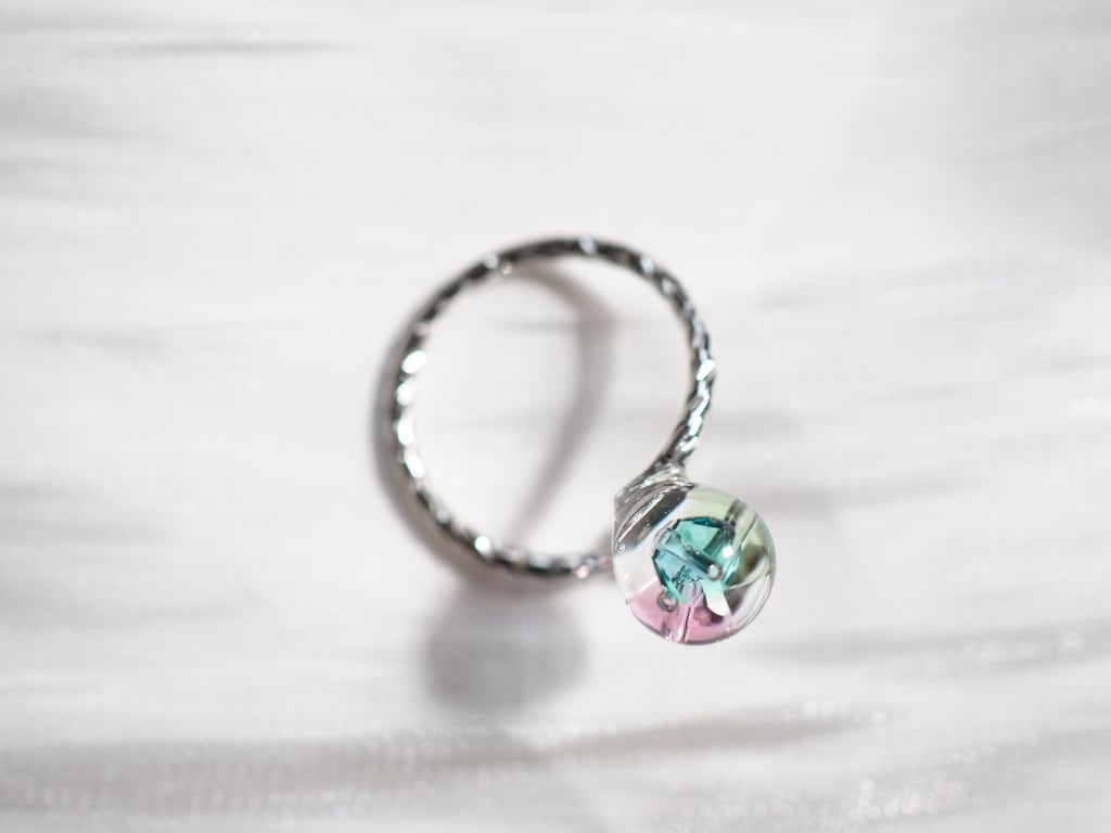 澄んだ樹脂ドームの中に高級クリスタルガラスを閉じ込めた、気品漂うハンドメイドリング。