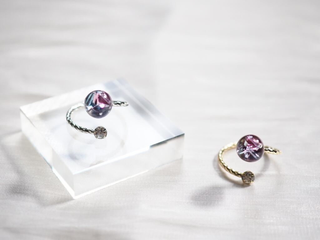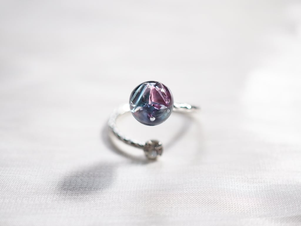 澄んだ樹脂ドームの中に高級クリスタルガラスを閉じ込めた、気品漂うハンドメイドリング。