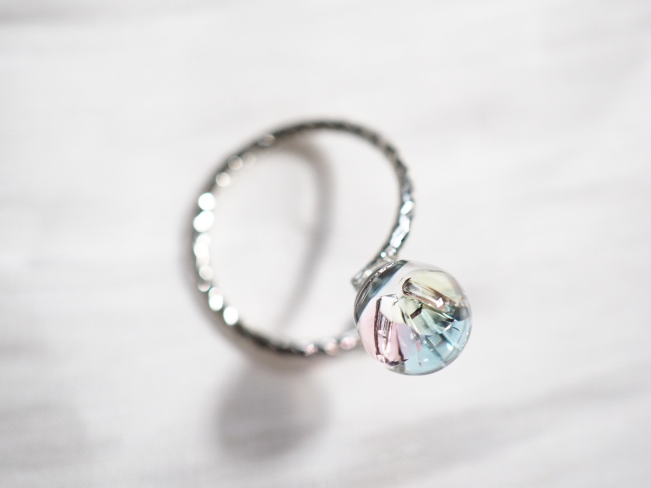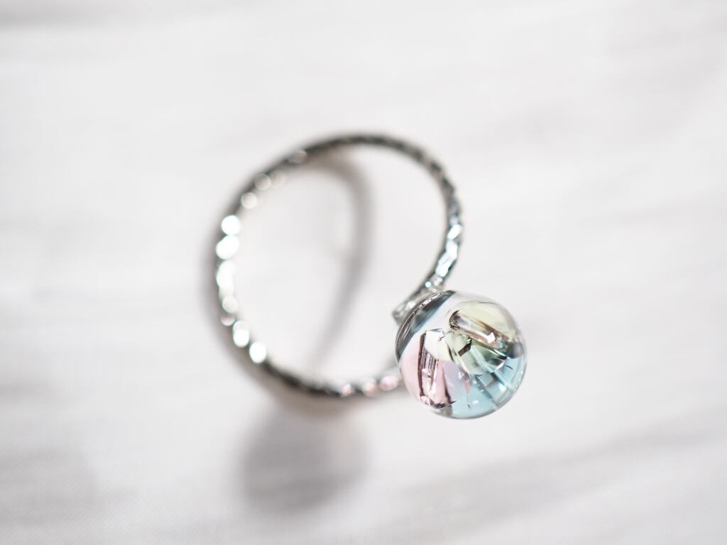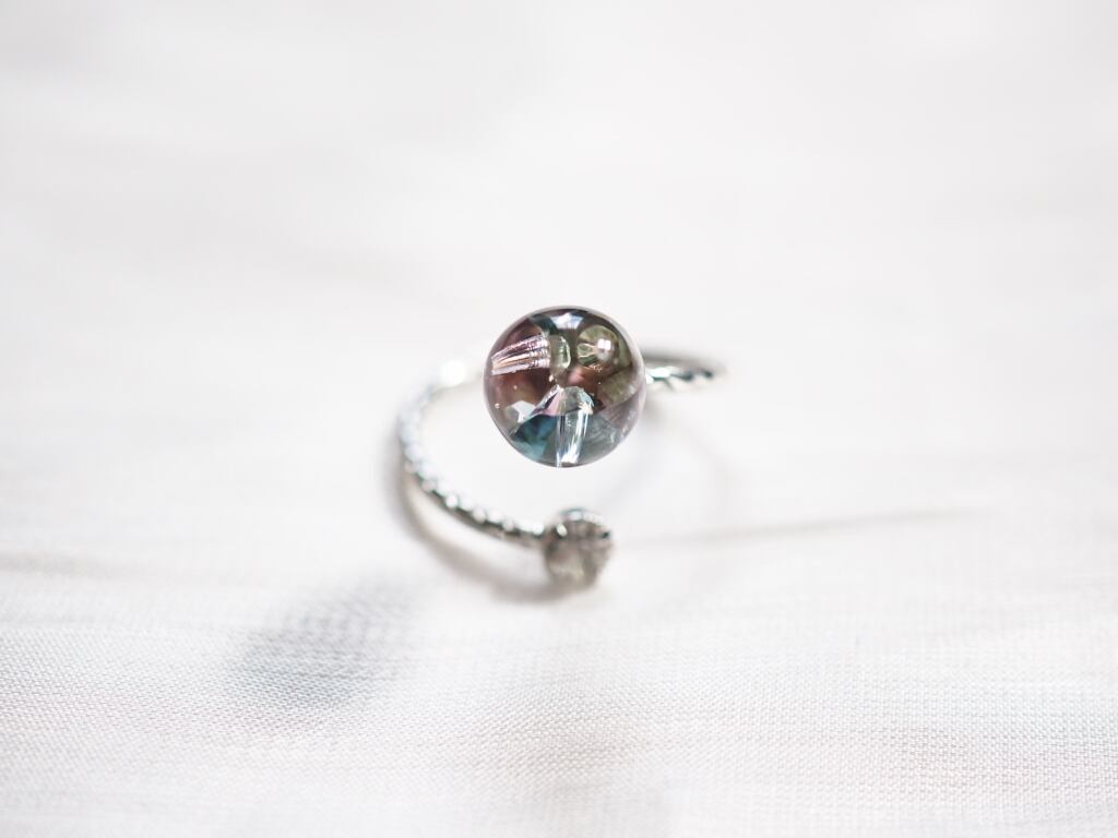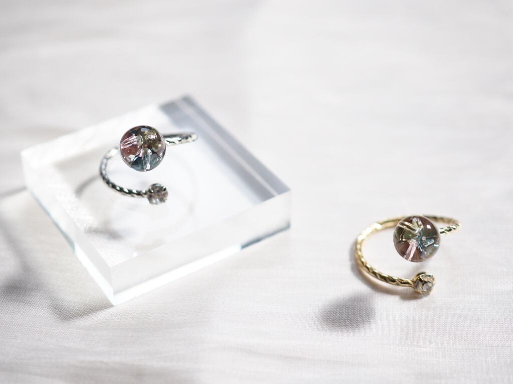 澄んだ樹脂ドームの中に高級クリスタルガラスを閉じ込めた、気品漂うハンドメイドリング。