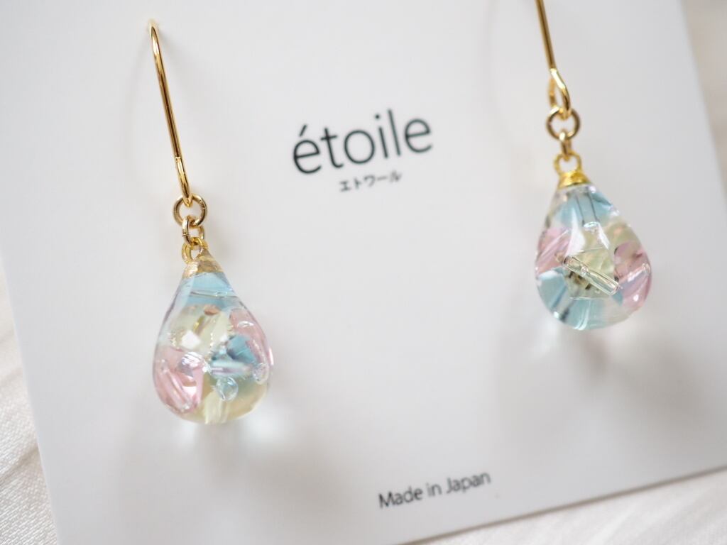 透明感あふれるしずく型に、高級クリスタルガラスを封じ込めた、気品漂うハンドメイドピアス/イヤリング。