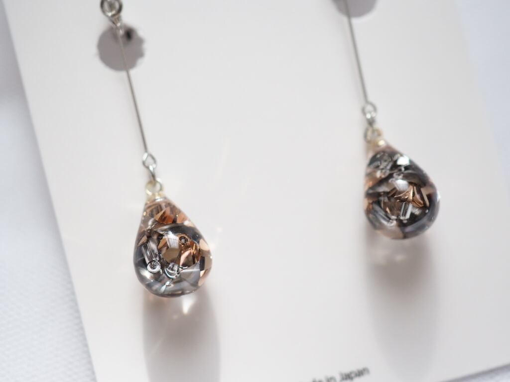 高級クリスタルガラスを閉じ込めた、澄んだしずく型をあしらった、ハンドメイドならではのロングデザインピアス/イヤリング。