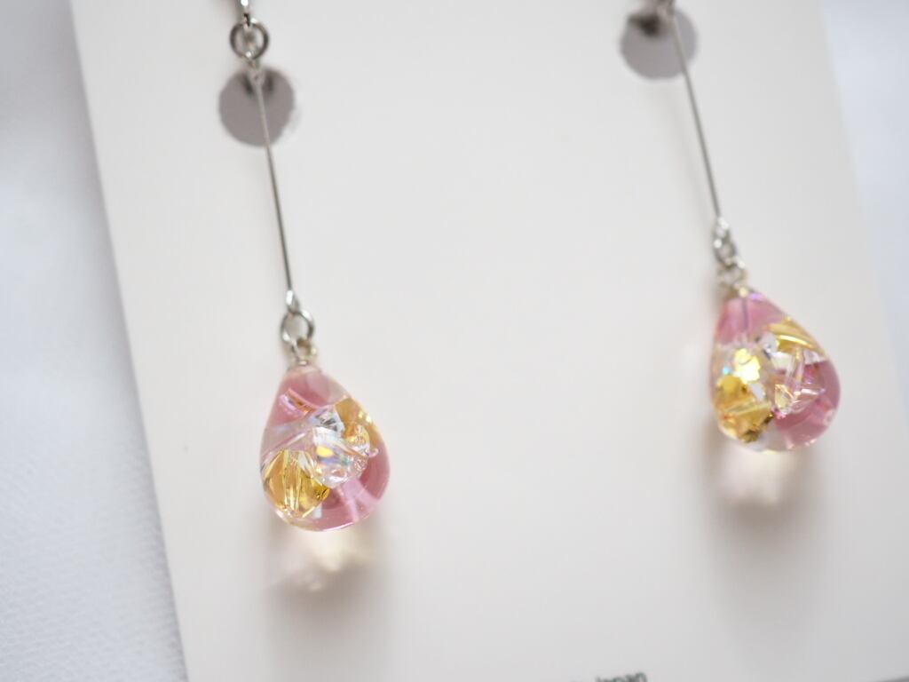 高級クリスタルガラスを閉じ込めた、澄んだしずく型をあしらった、ハンドメイドならではのロングデザインピアス/イヤリング。