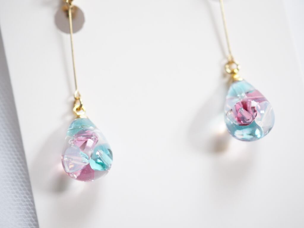 高級クリスタルガラスを閉じ込めた、澄んだしずく型をあしらった、ハンドメイドならではのロングデザインピアス/イヤリング。
