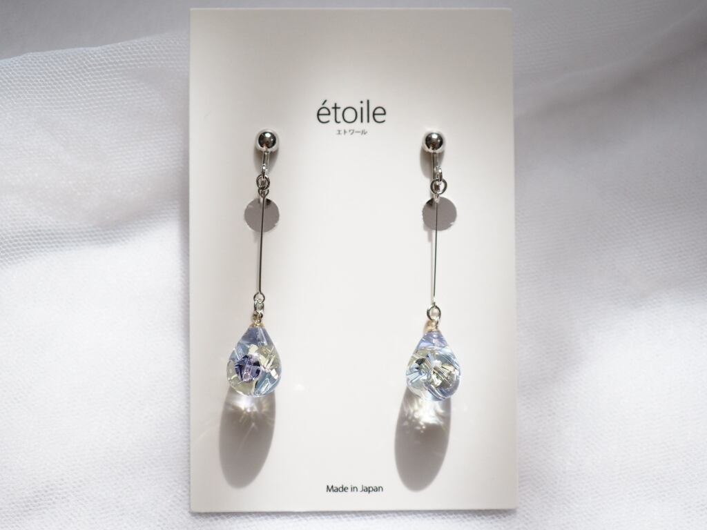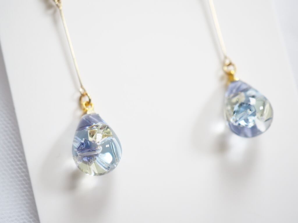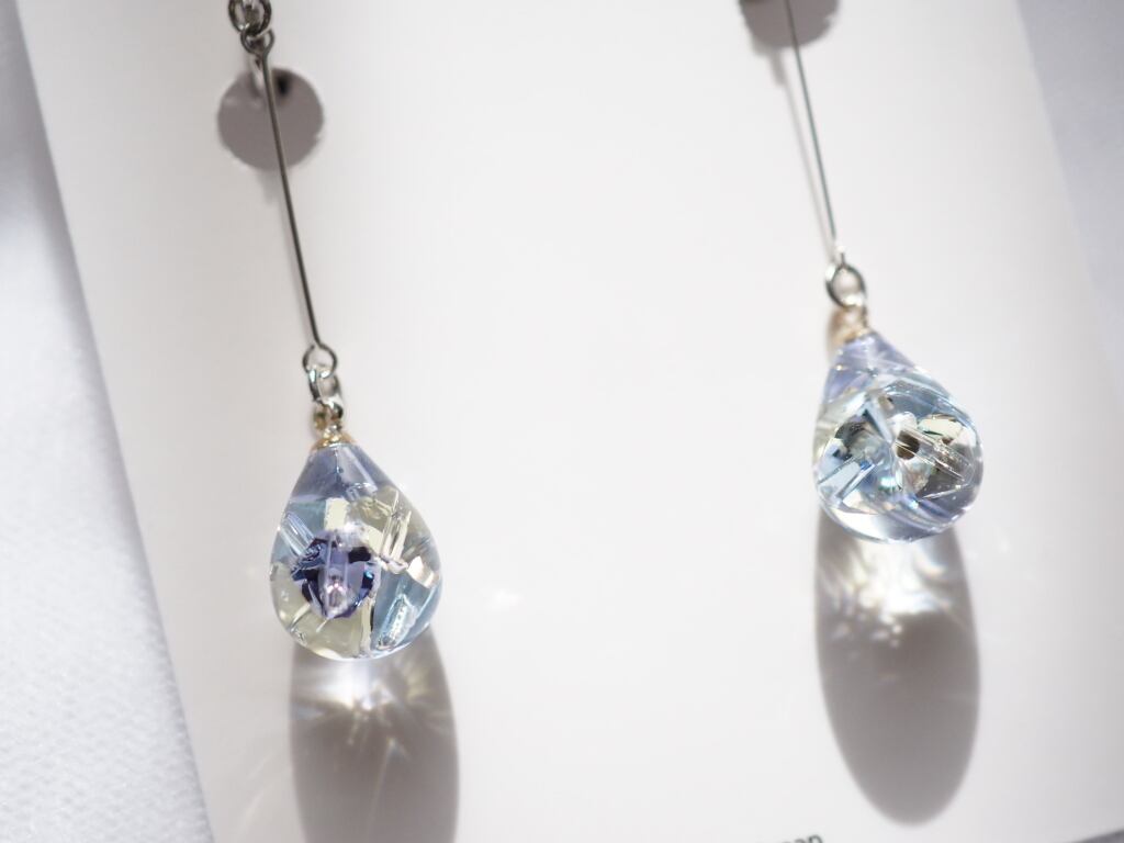 高級クリスタルガラスを閉じ込めた、澄んだしずく型をあしらった、ハンドメイドならではのロングデザインピアス/イヤリング。