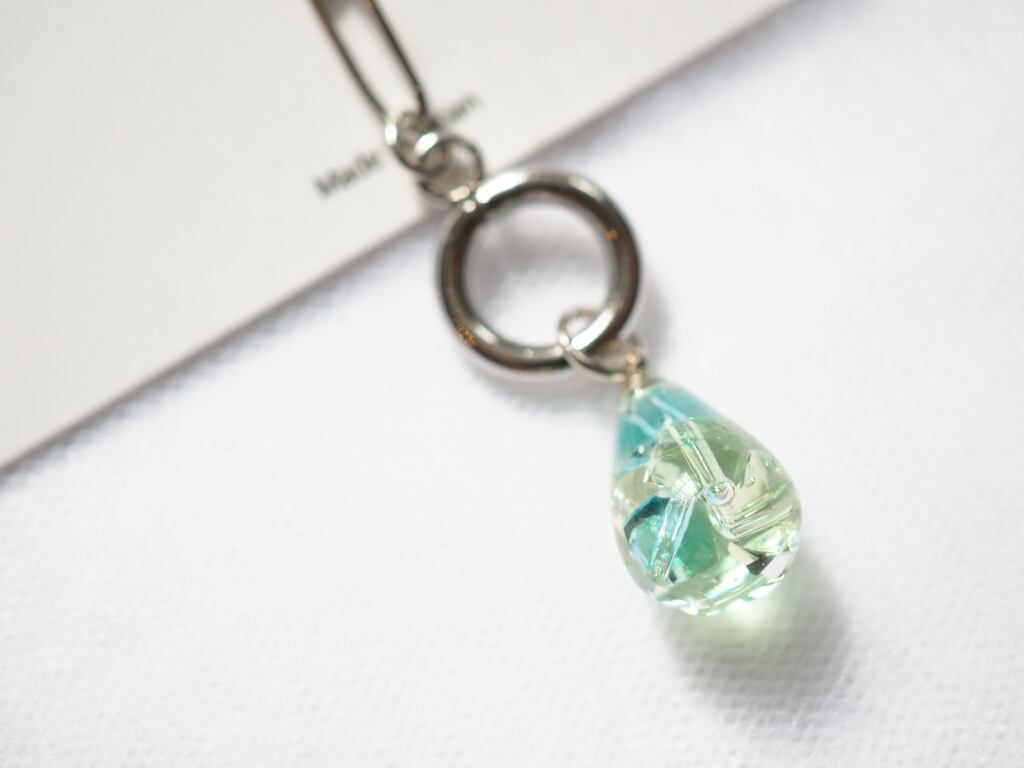 しずく型に高級クリスタルガラスを閉じ込めた、洗練されたハンドメイドネックレス。