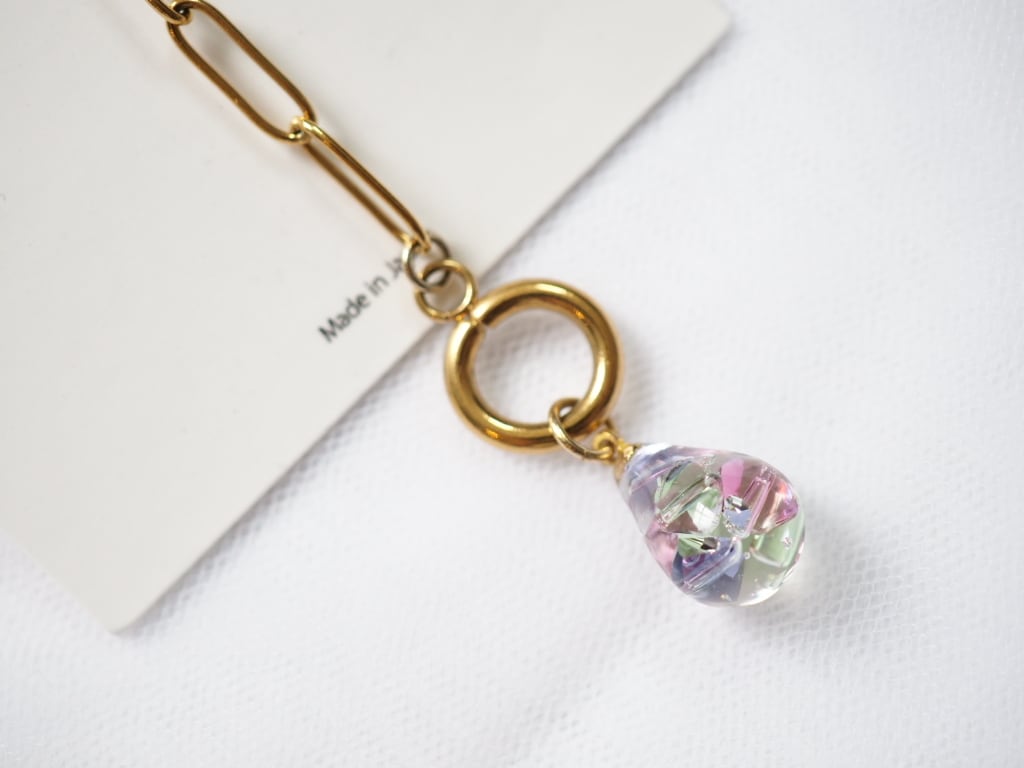 しずく型に高級クリスタルガラスを閉じ込めた、洗練されたハンドメイドネックレス。