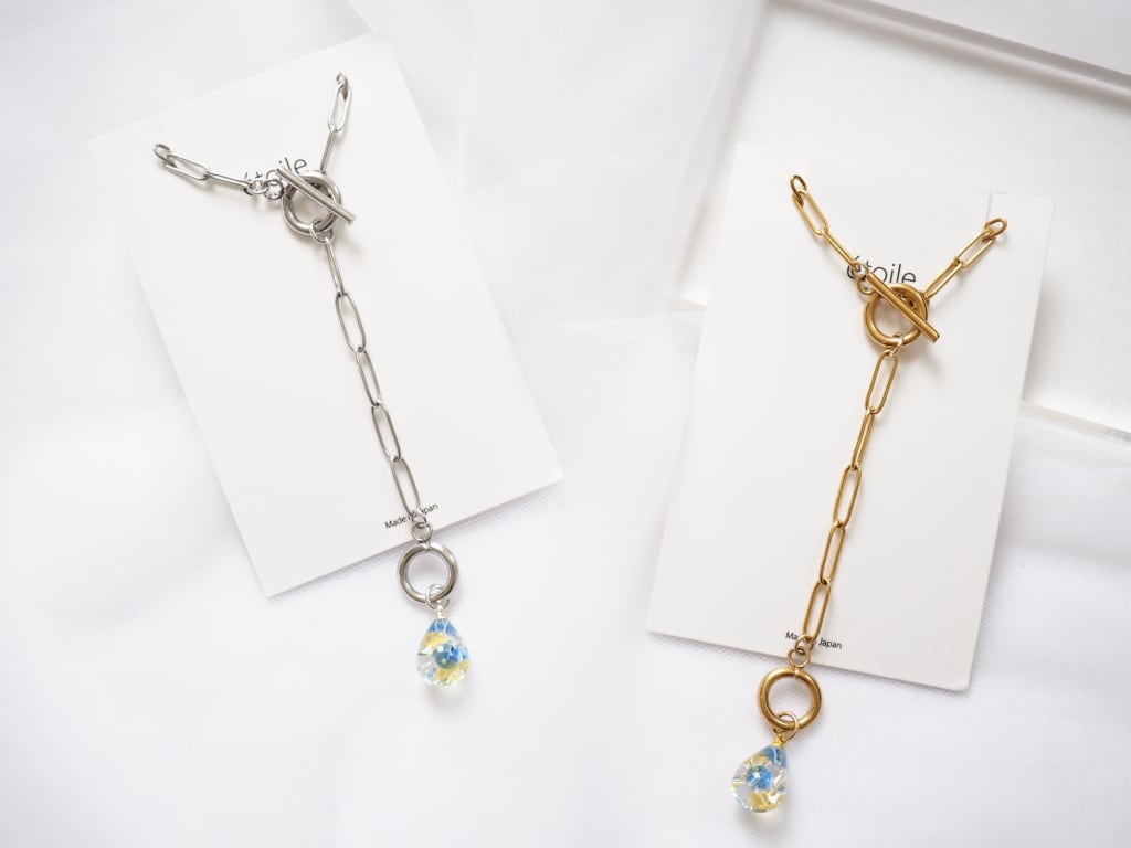しずく型に高級クリスタルガラスを閉じ込めた、洗練されたハンドメイドネックレス。