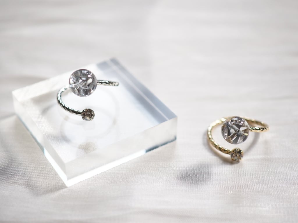 透明感のあるガラスの中できらめく高級クリスタルガラスは、動きに合わせて輝きを放ち、上品で大人可愛い印象に。