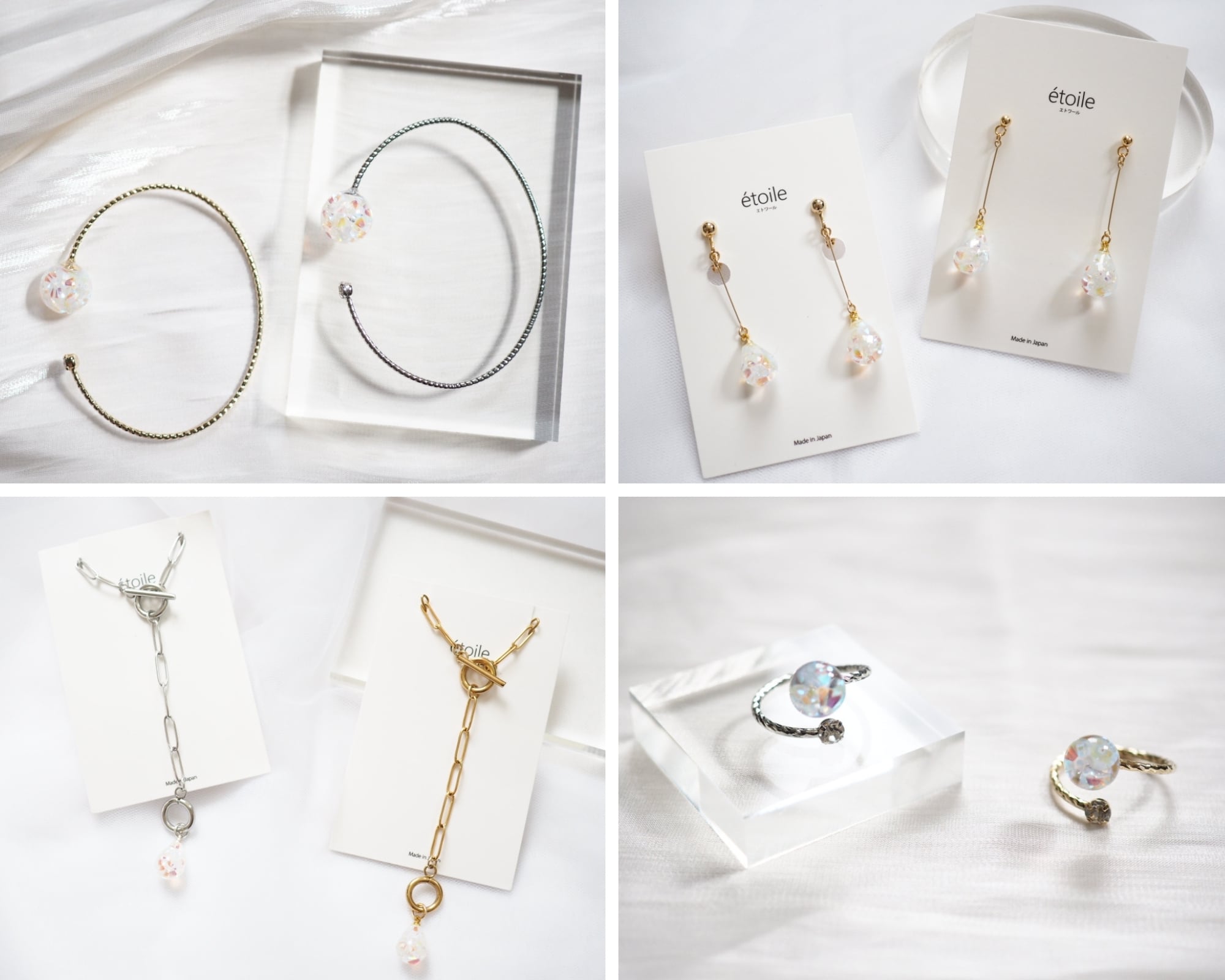 人気の高級クリスタルガラスを閉じ込めたシリーズから、ピアス/イヤリング・バングル・リング・ネックレスをまとめて楽しめるお得なセットが登場しました。