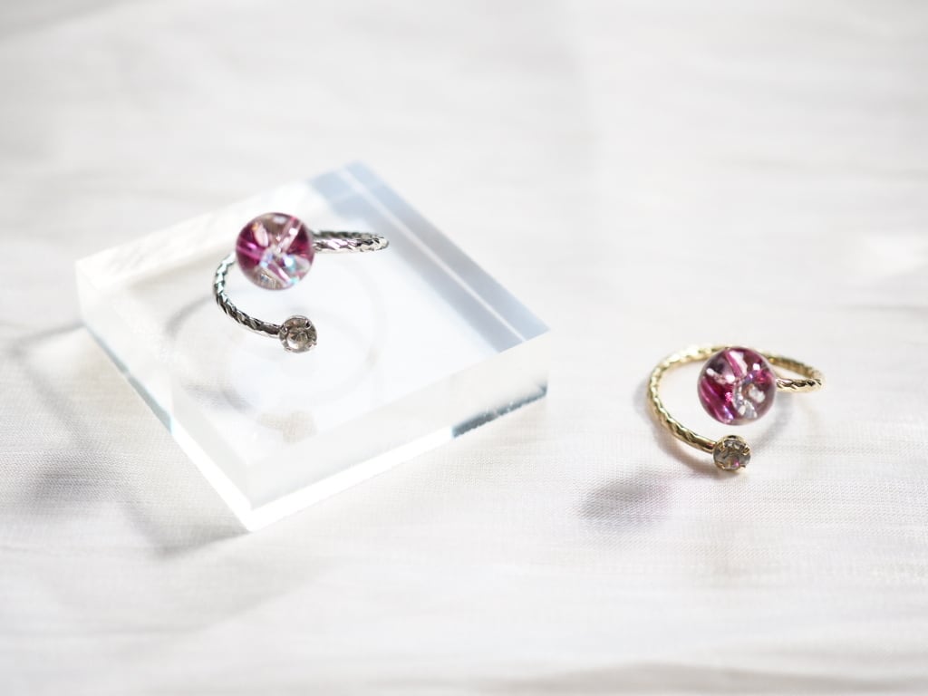 透明感のあるガラスの中できらめく高級クリスタルガラスは、動きに合わせて輝きを放ち、上品で大人可愛い印象に。