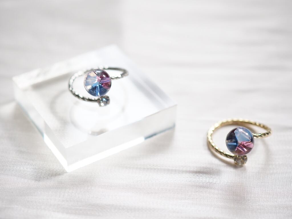透明感のあるガラスの中できらめく高級クリスタルガラスは、動きに合わせて輝きを放ち、上品で大人可愛い印象に。
