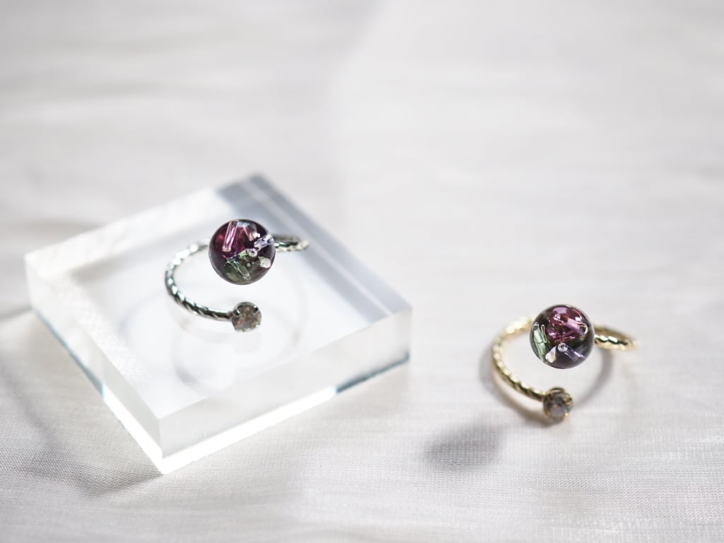 透明感のあるガラスの中できらめく高級クリスタルガラスは、動きに合わせて輝きを放ち、上品で大人可愛い印象に。