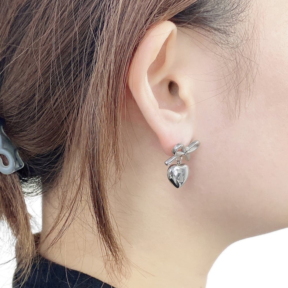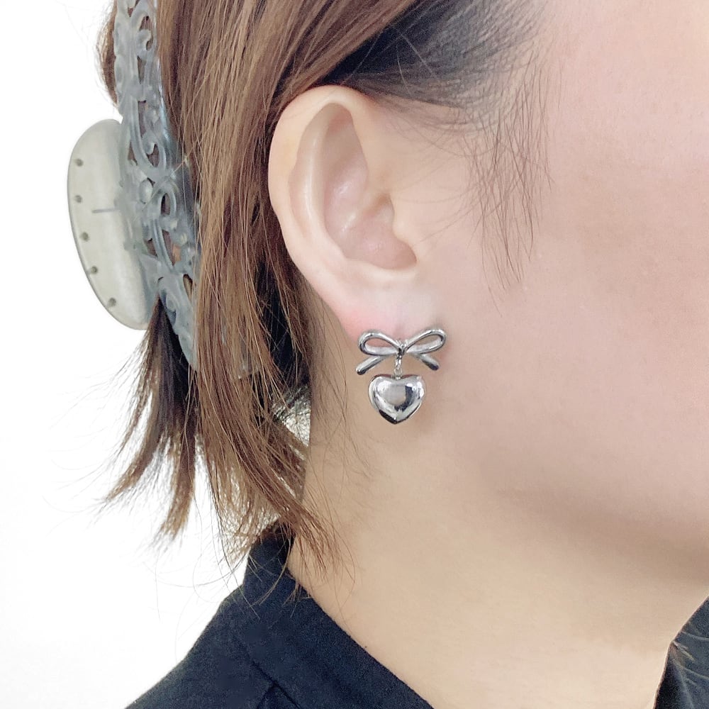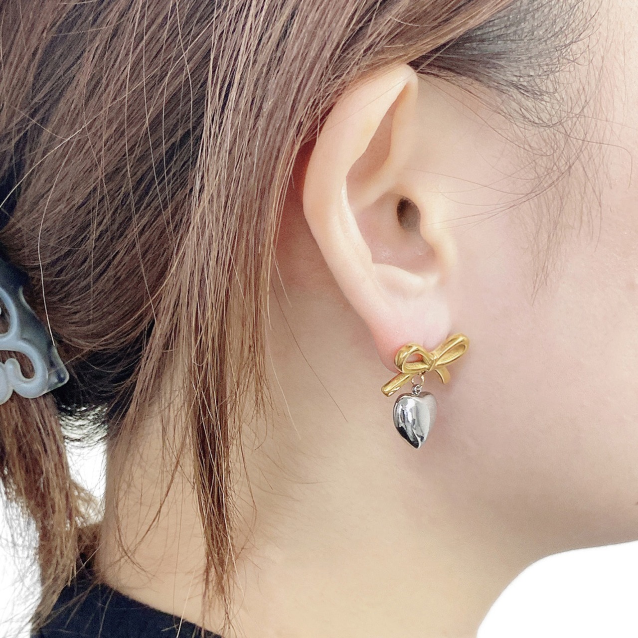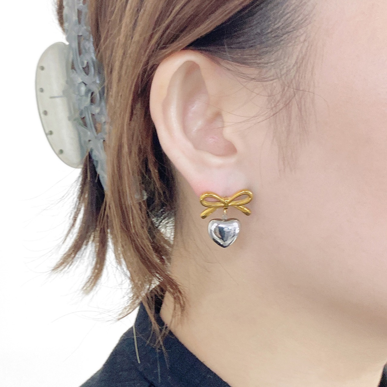 上品で遊び心を感じられる、リボン&ハートピアス。