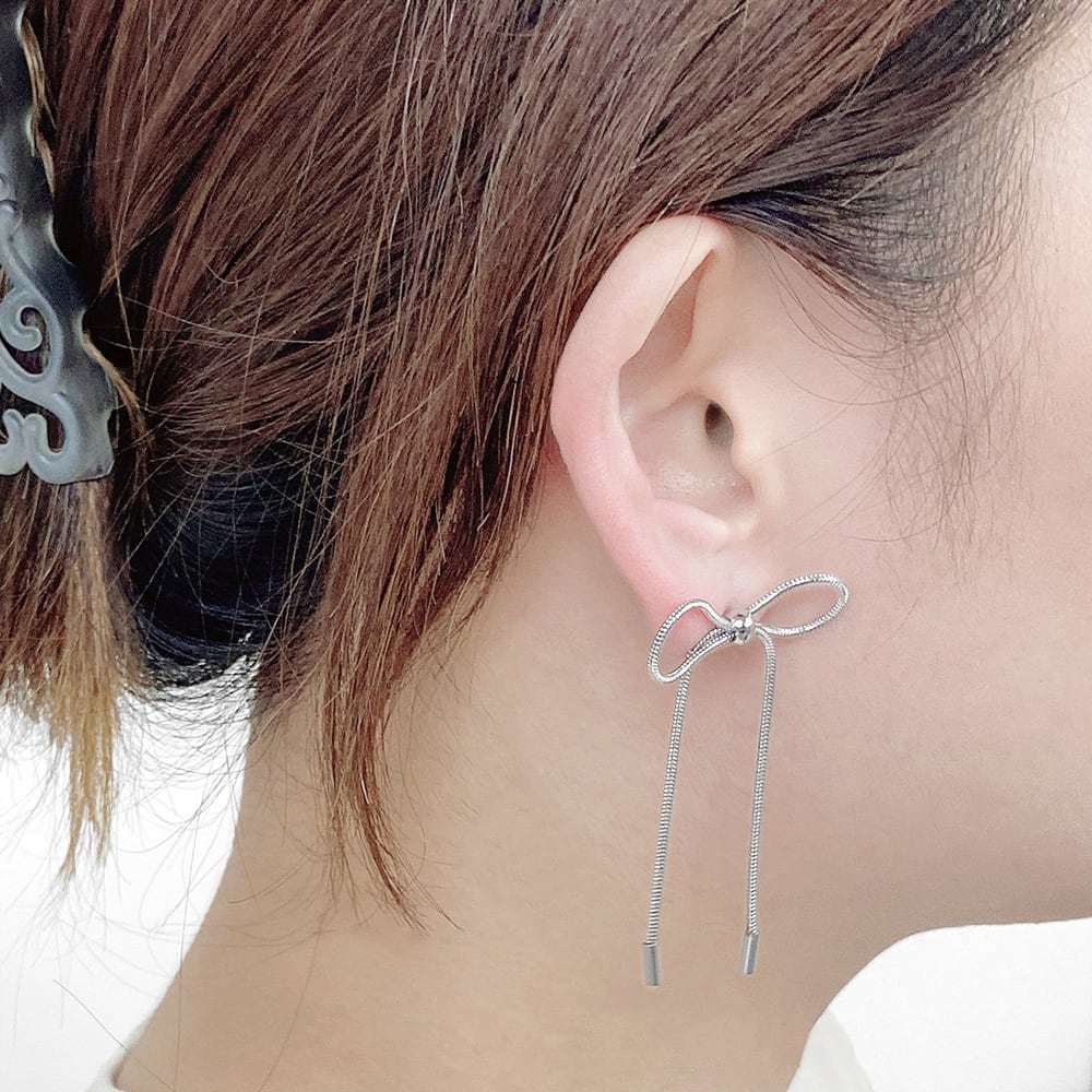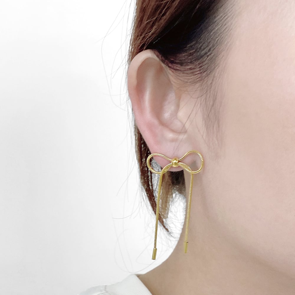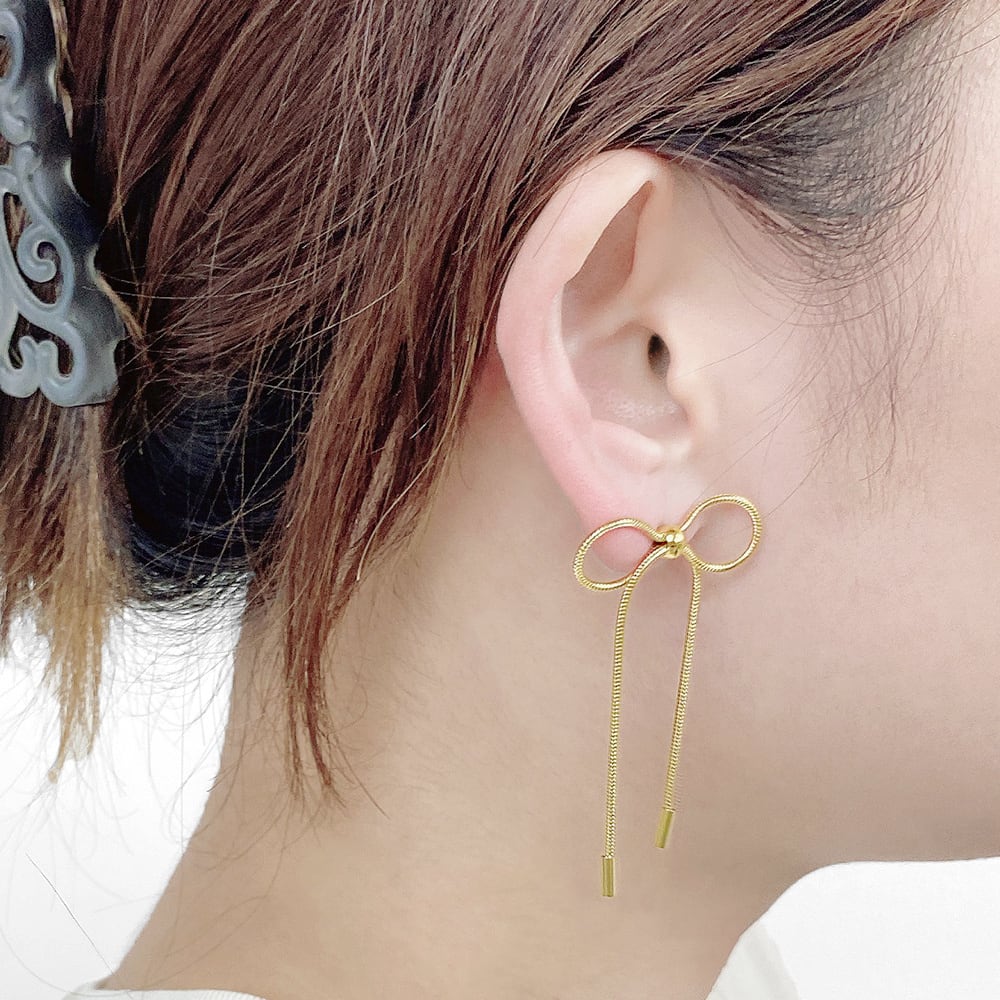華やかに耳元で揺れるリボンチェーンピアス。
