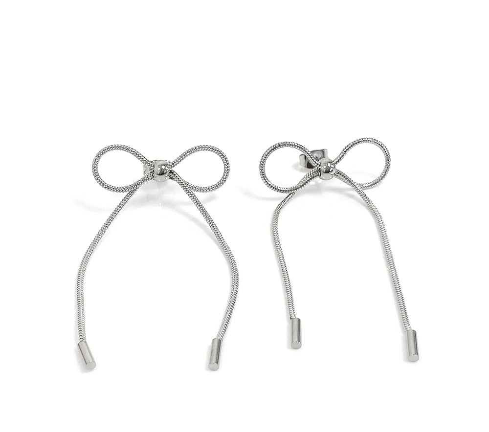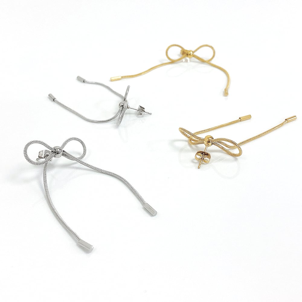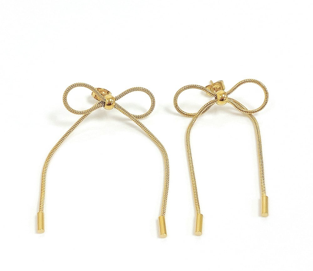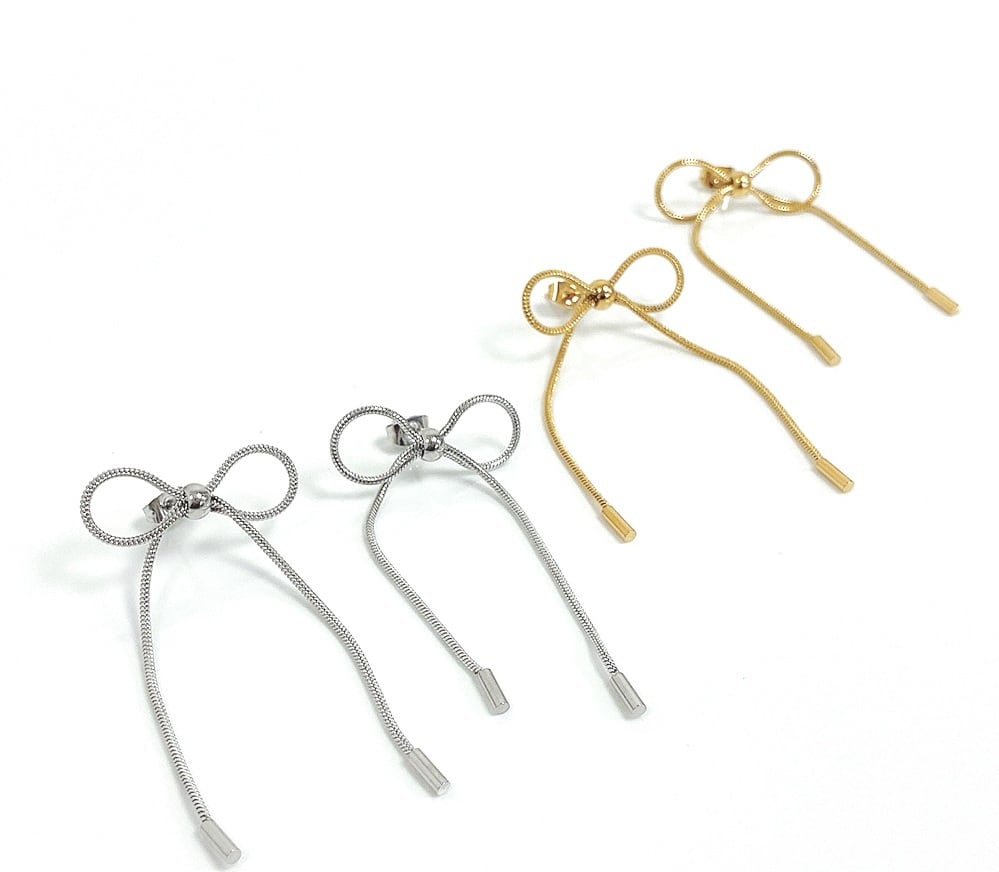 華やかに耳元で揺れるリボンチェーンピアス。