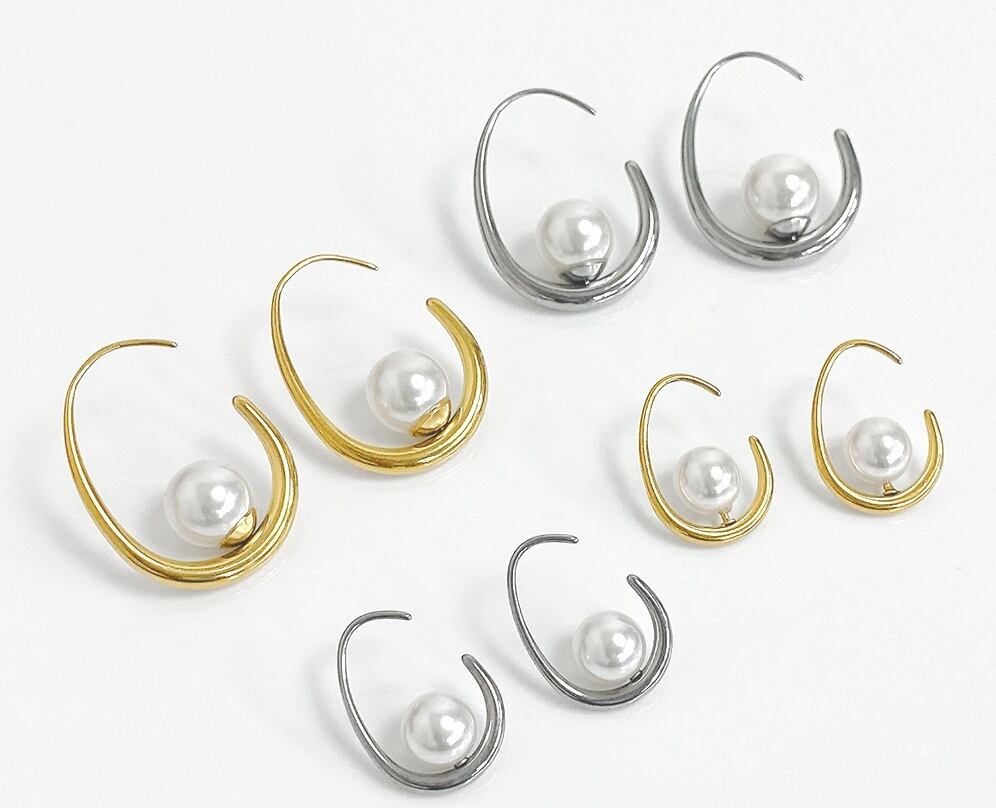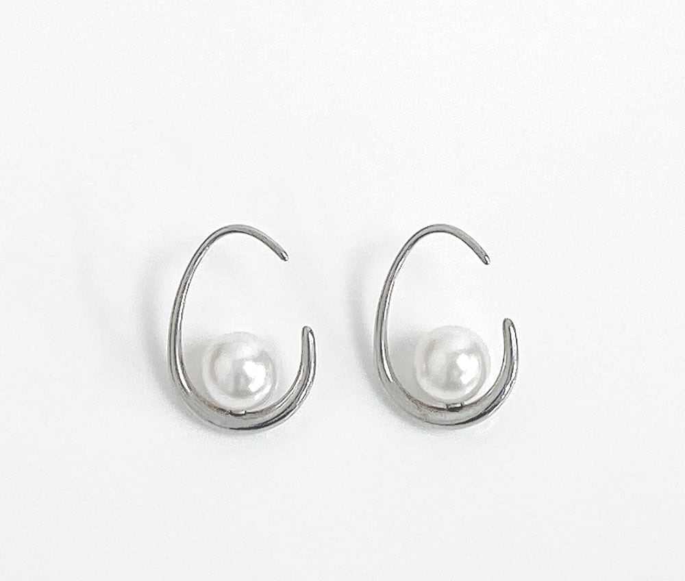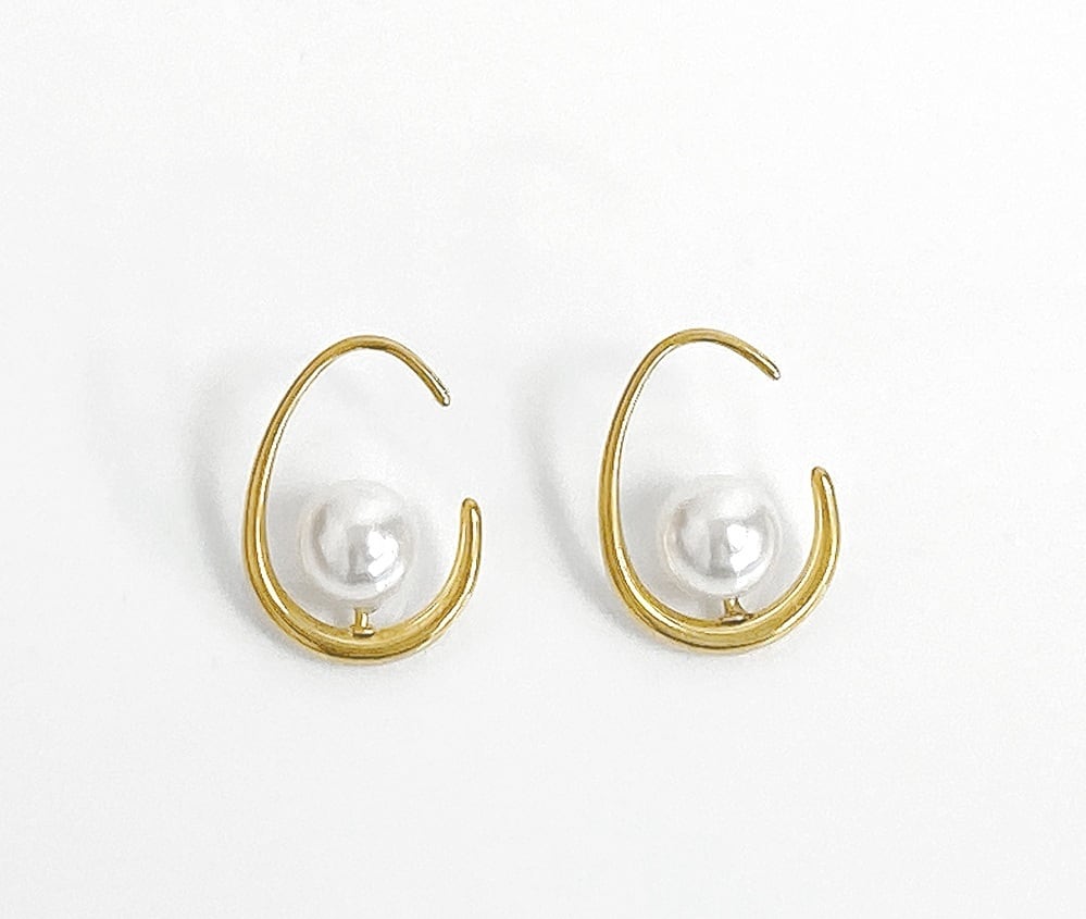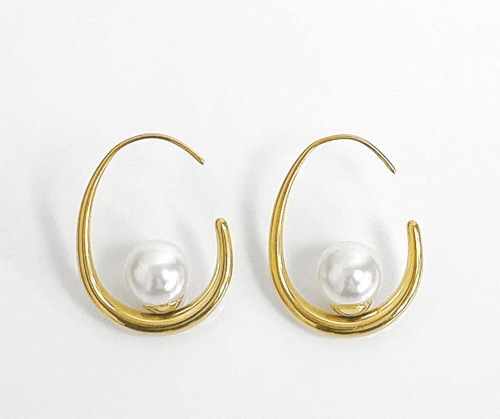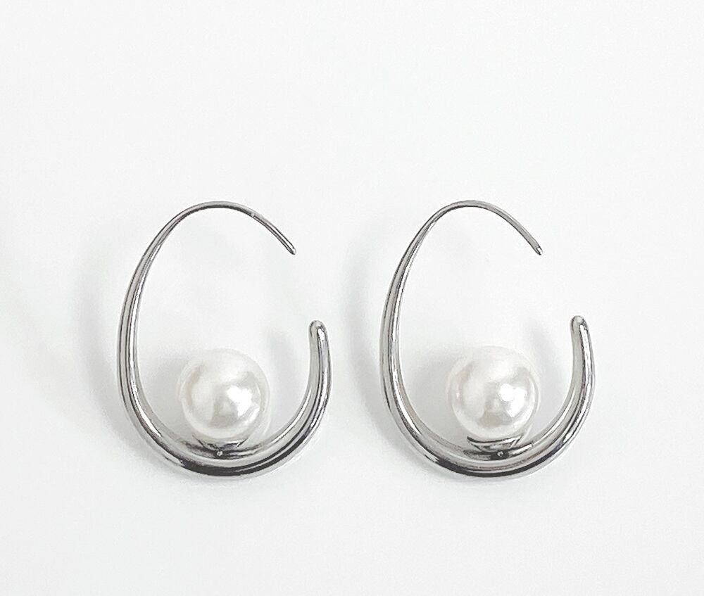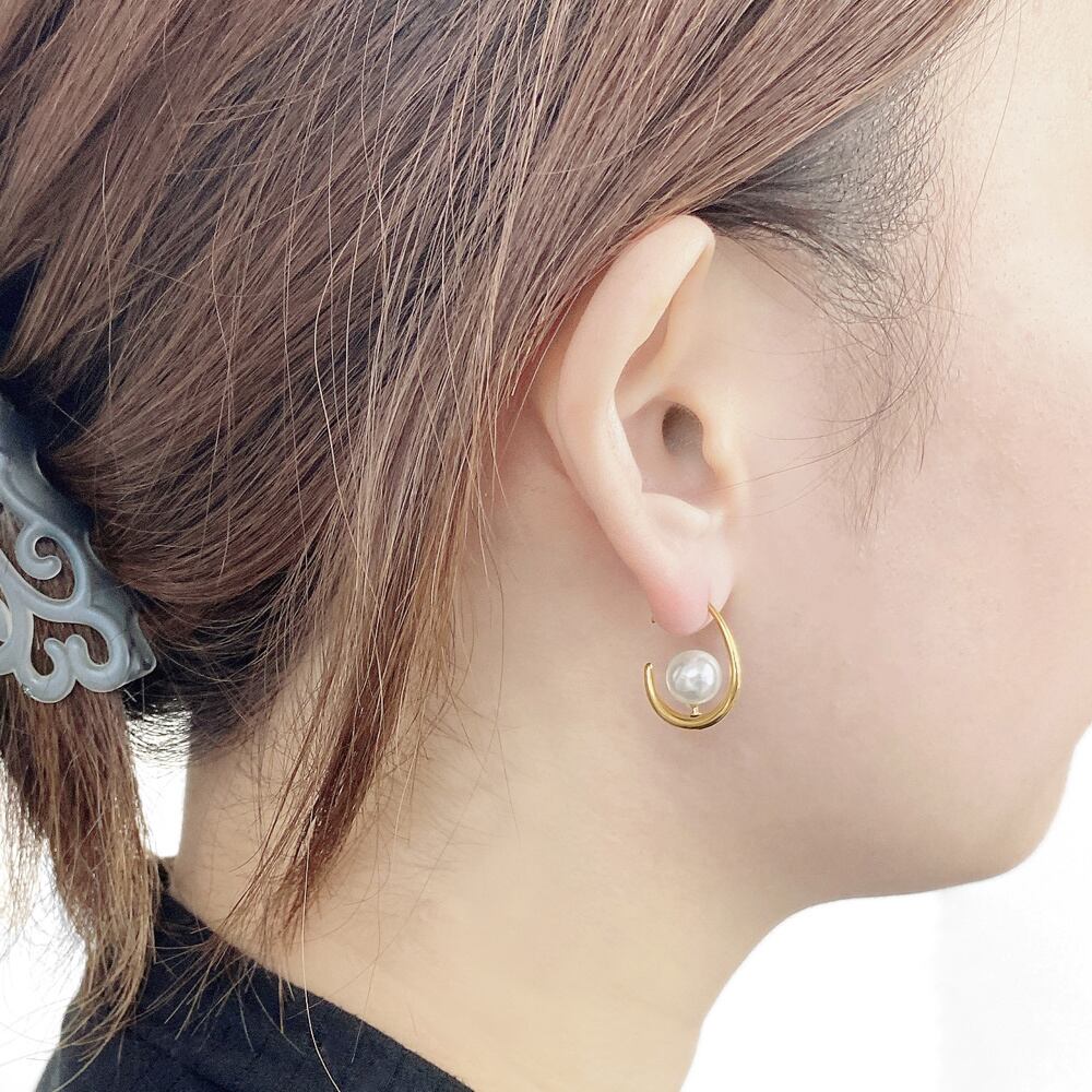 シンプルで清楚な印象のパール付ドロップフープピアス。