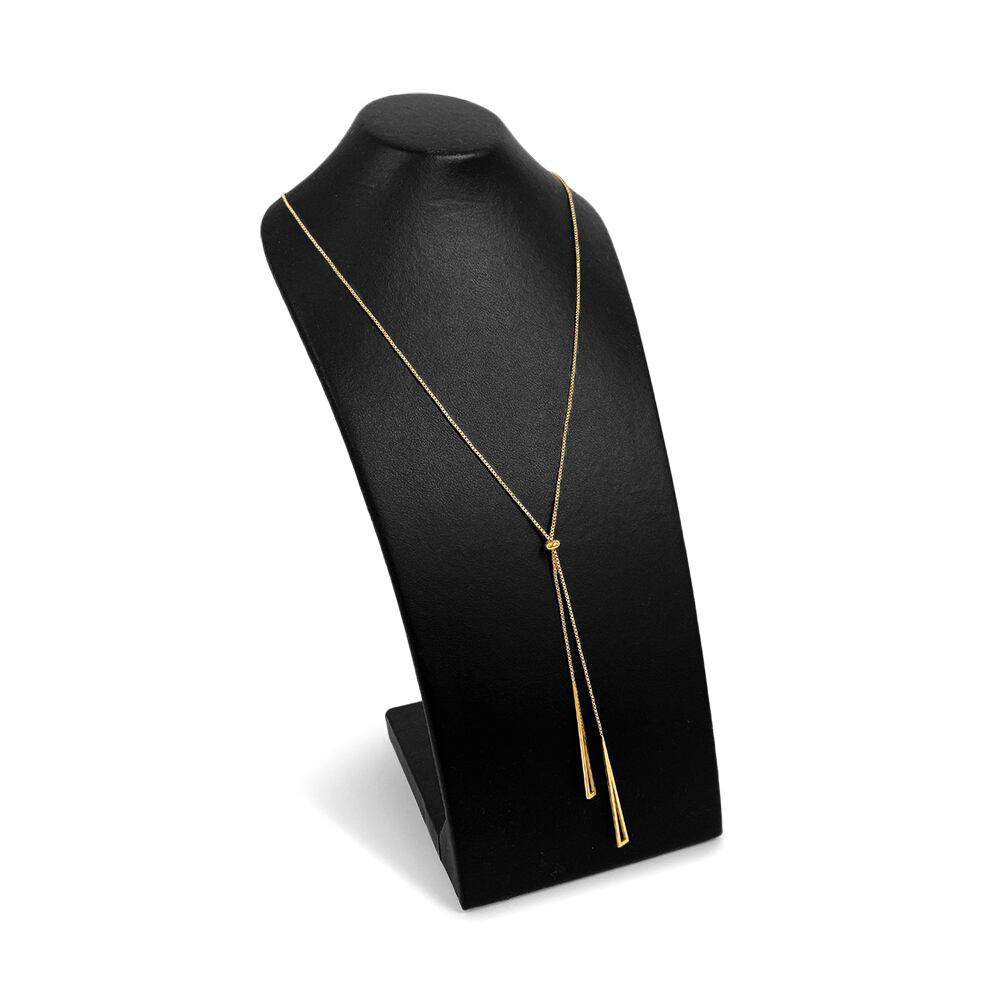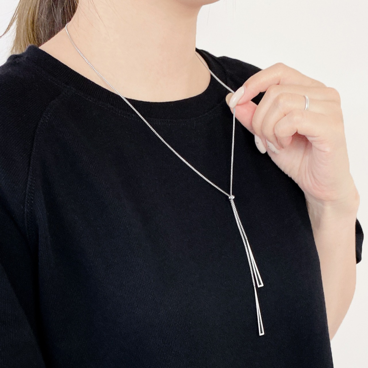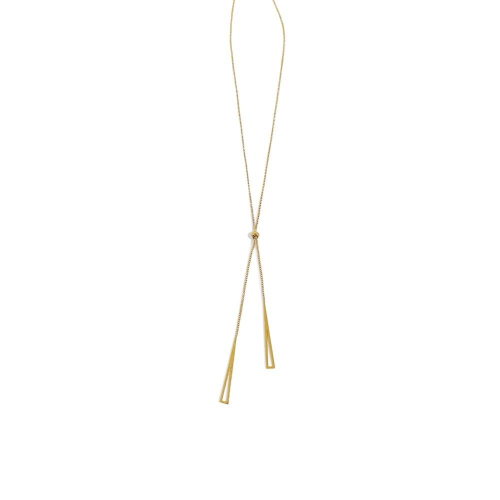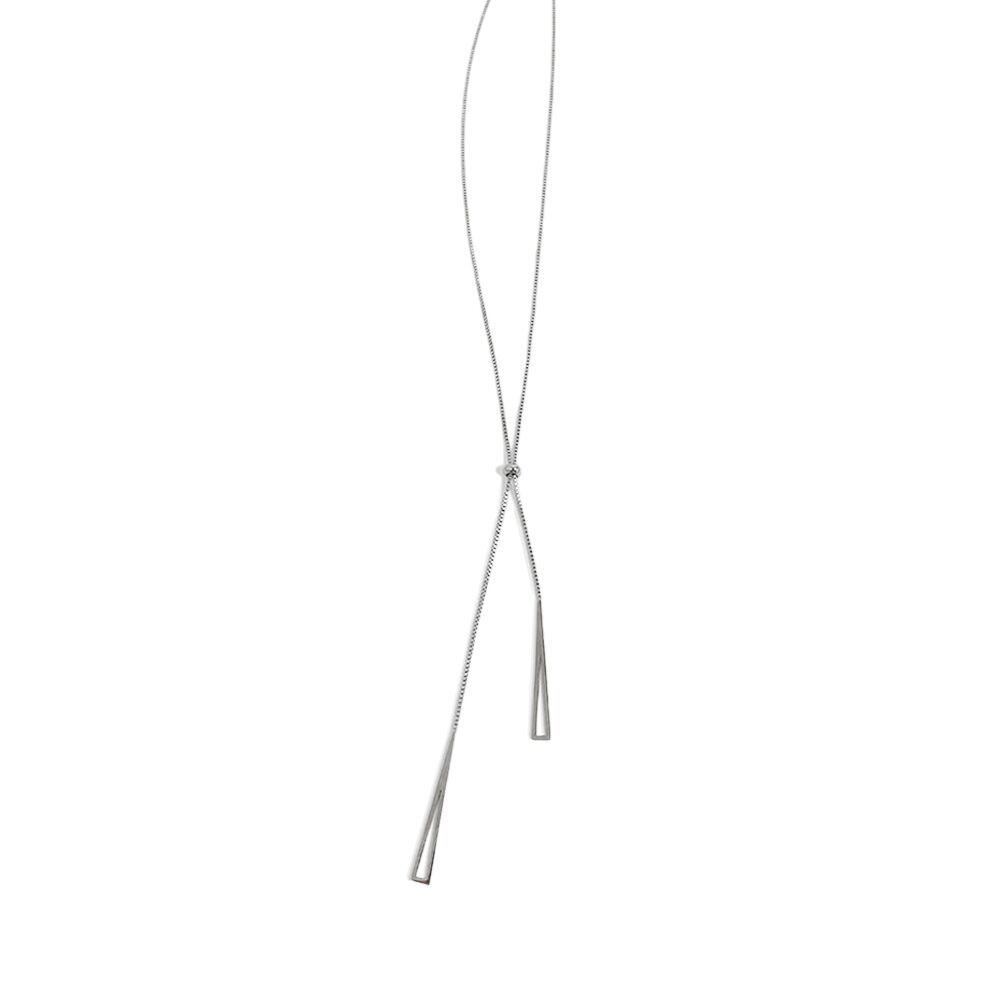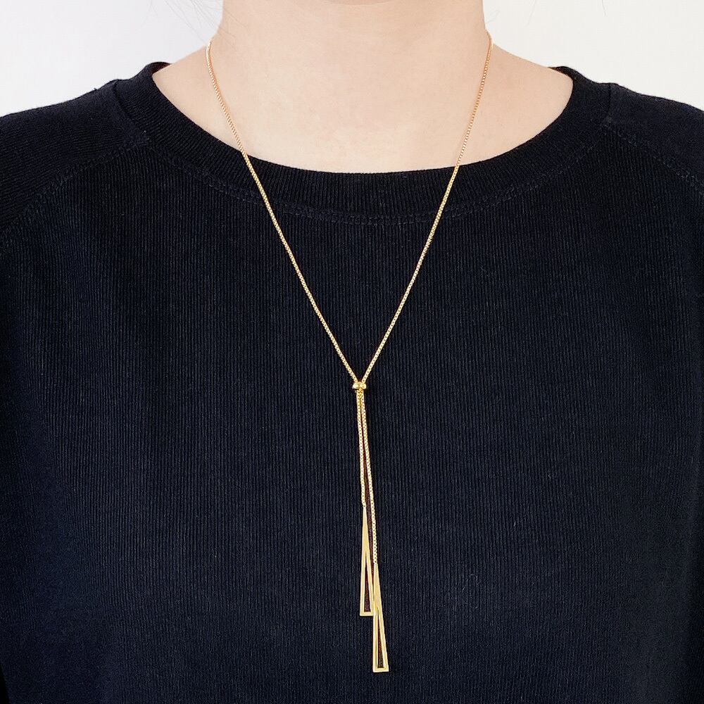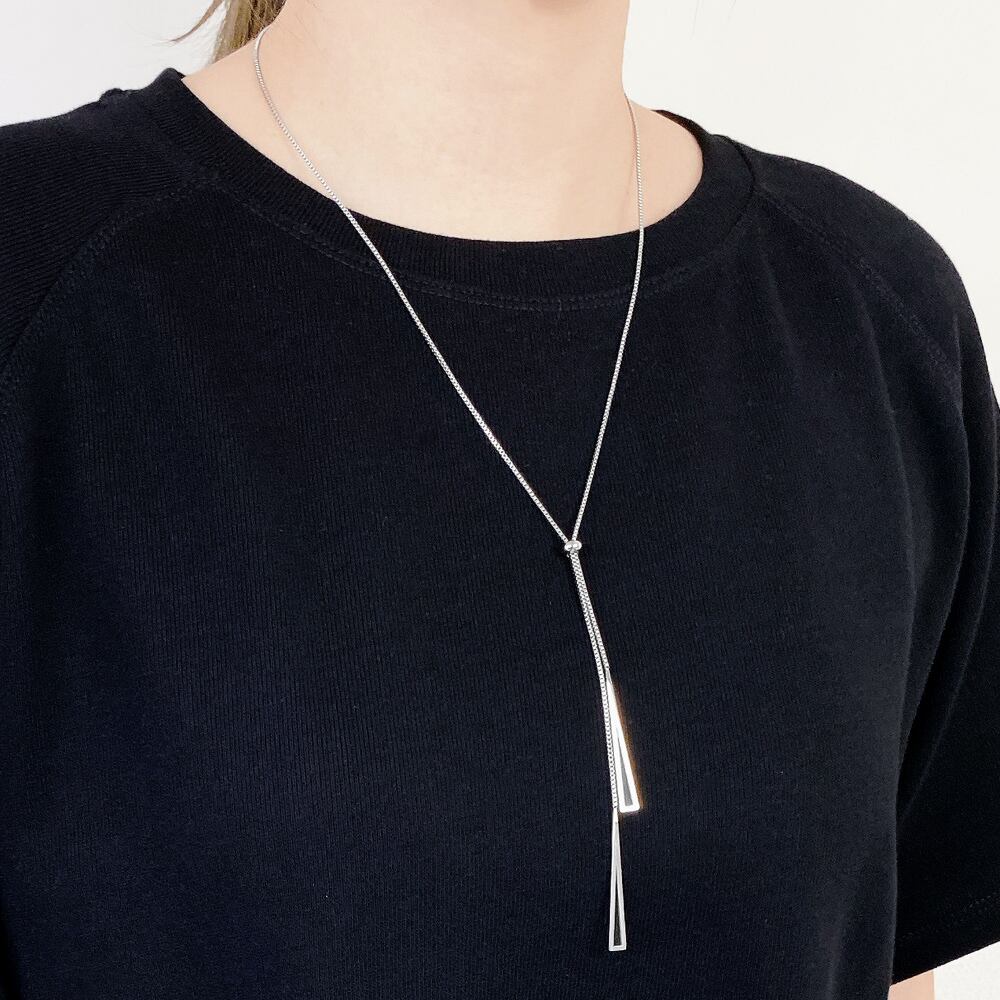 洗練された印象を与えるデザインのトライアングルロングネックレス。