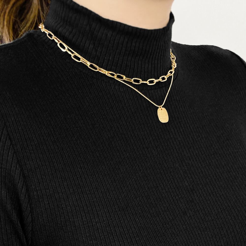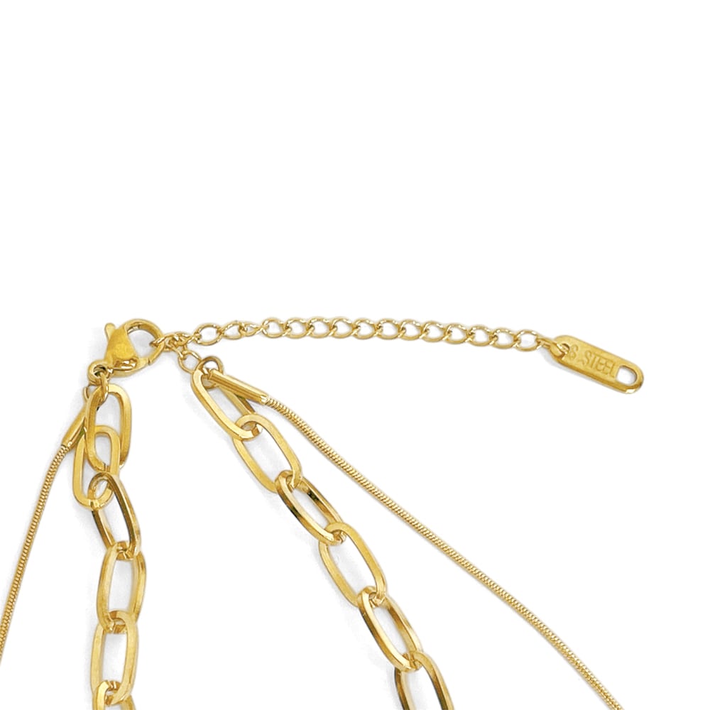 プレート型のワントップに2連チェーンがついた高見えデザインはエレガントな胸元へ導き、ワンピースやニットなどにも合わせやすく、シンプルなスタイリングも一気に華やかな装いにしてくれます。